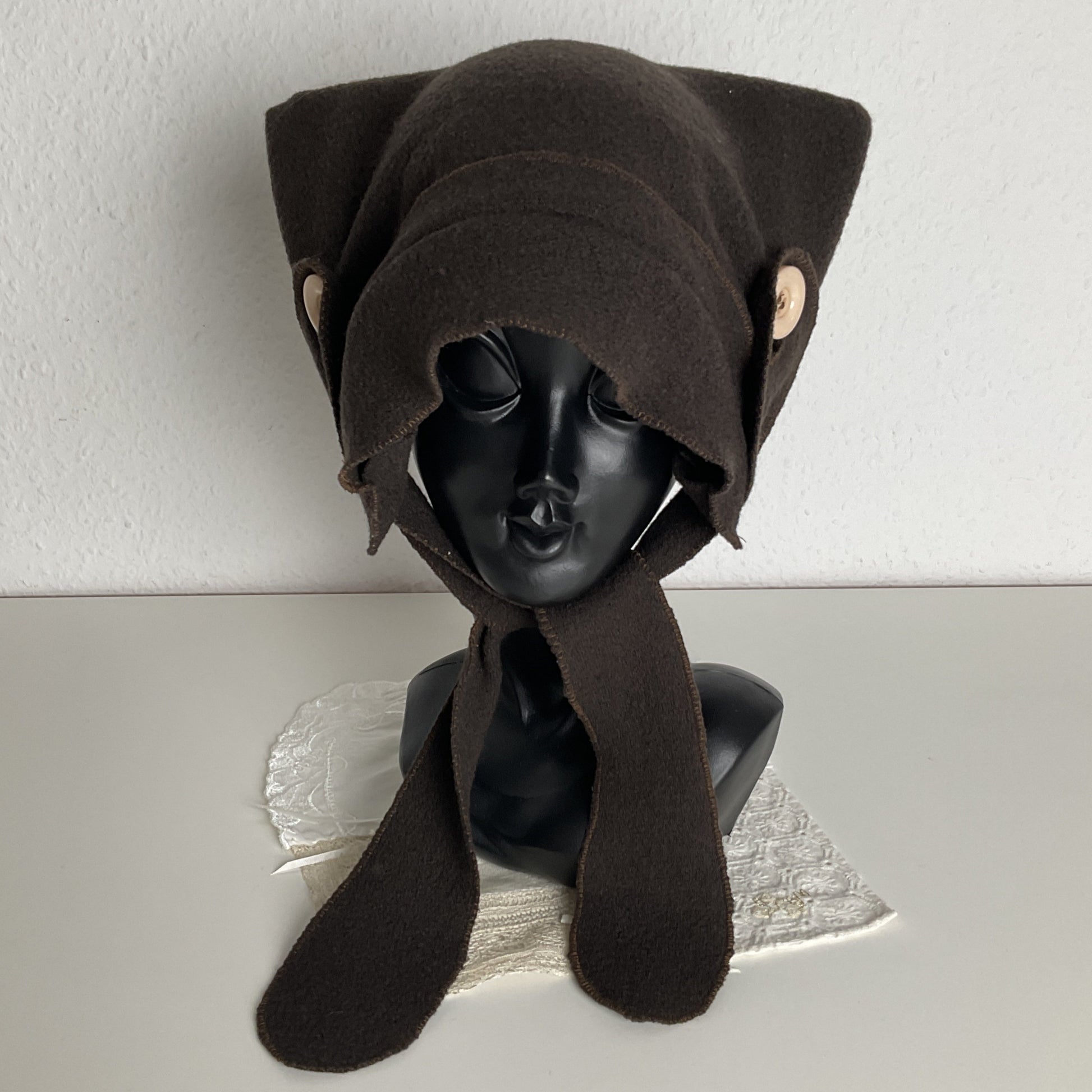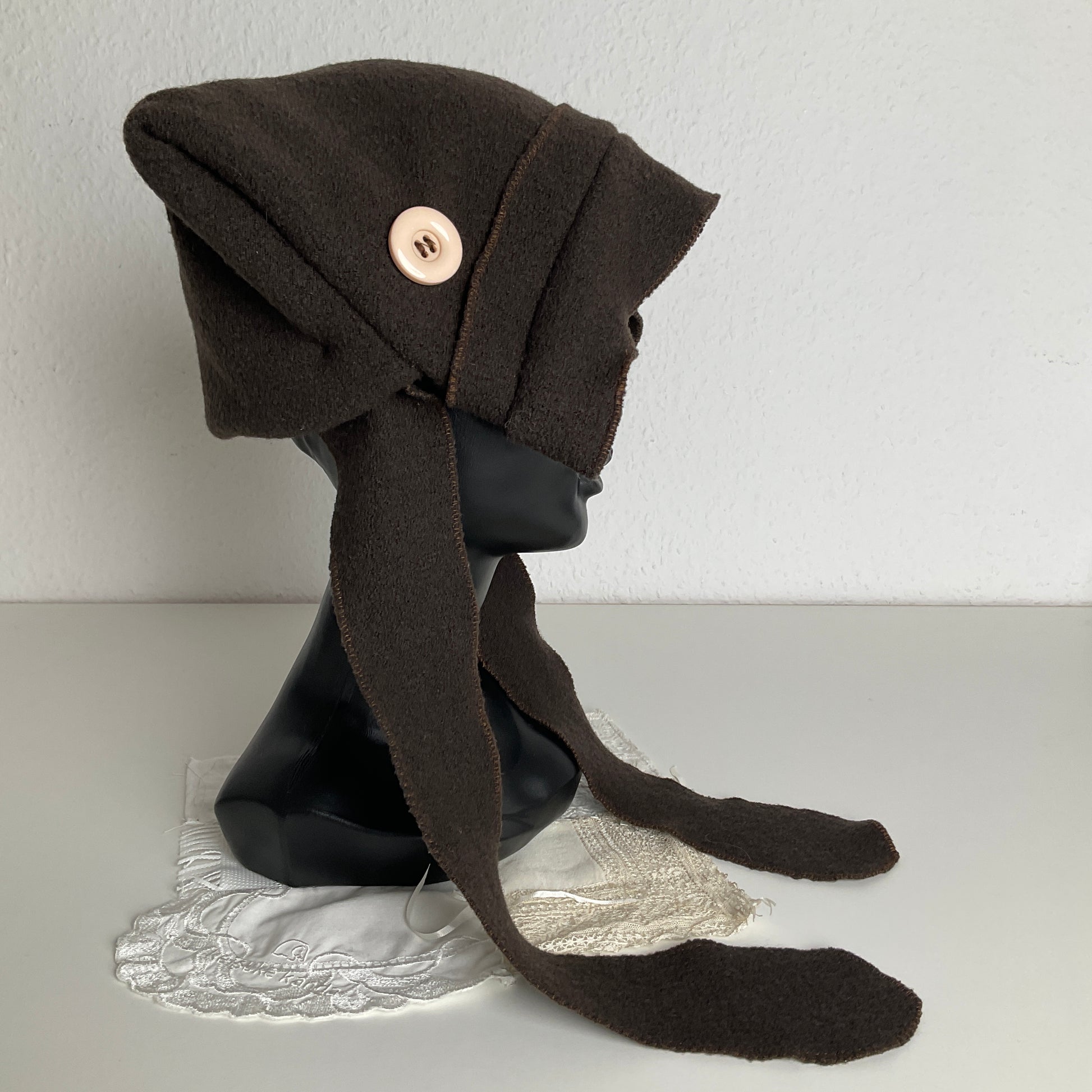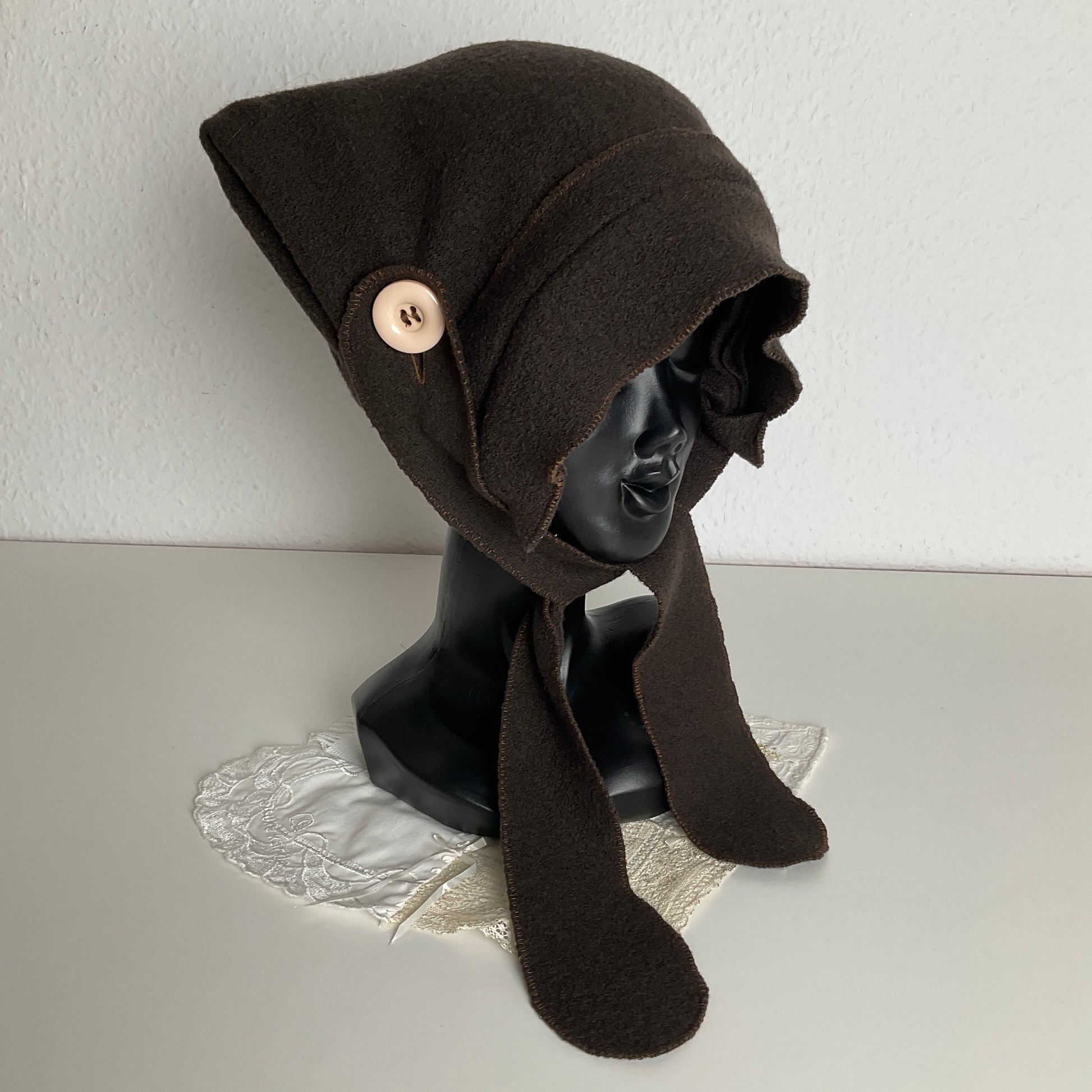Pointy maiden bonnet in cozy virgin wool fabric.