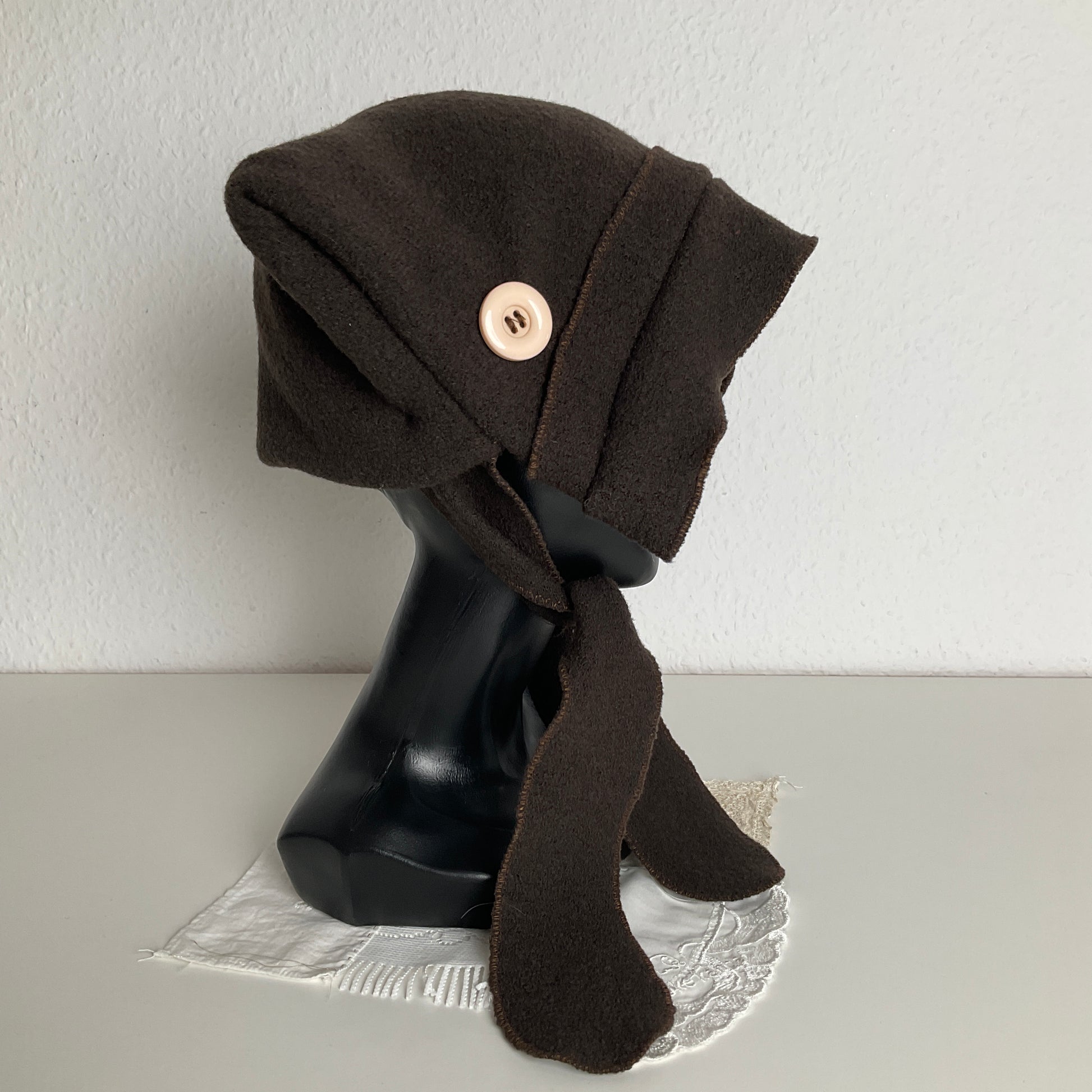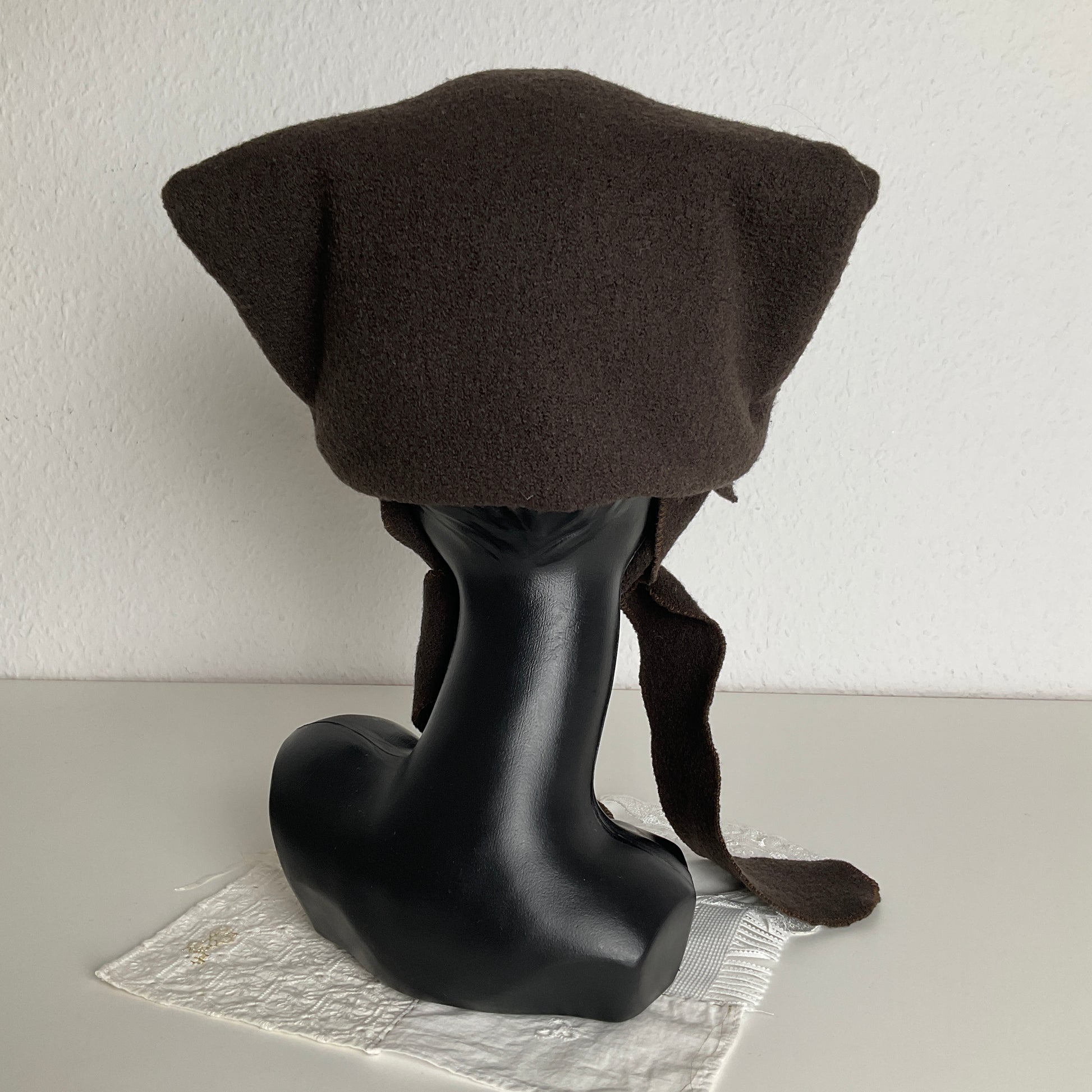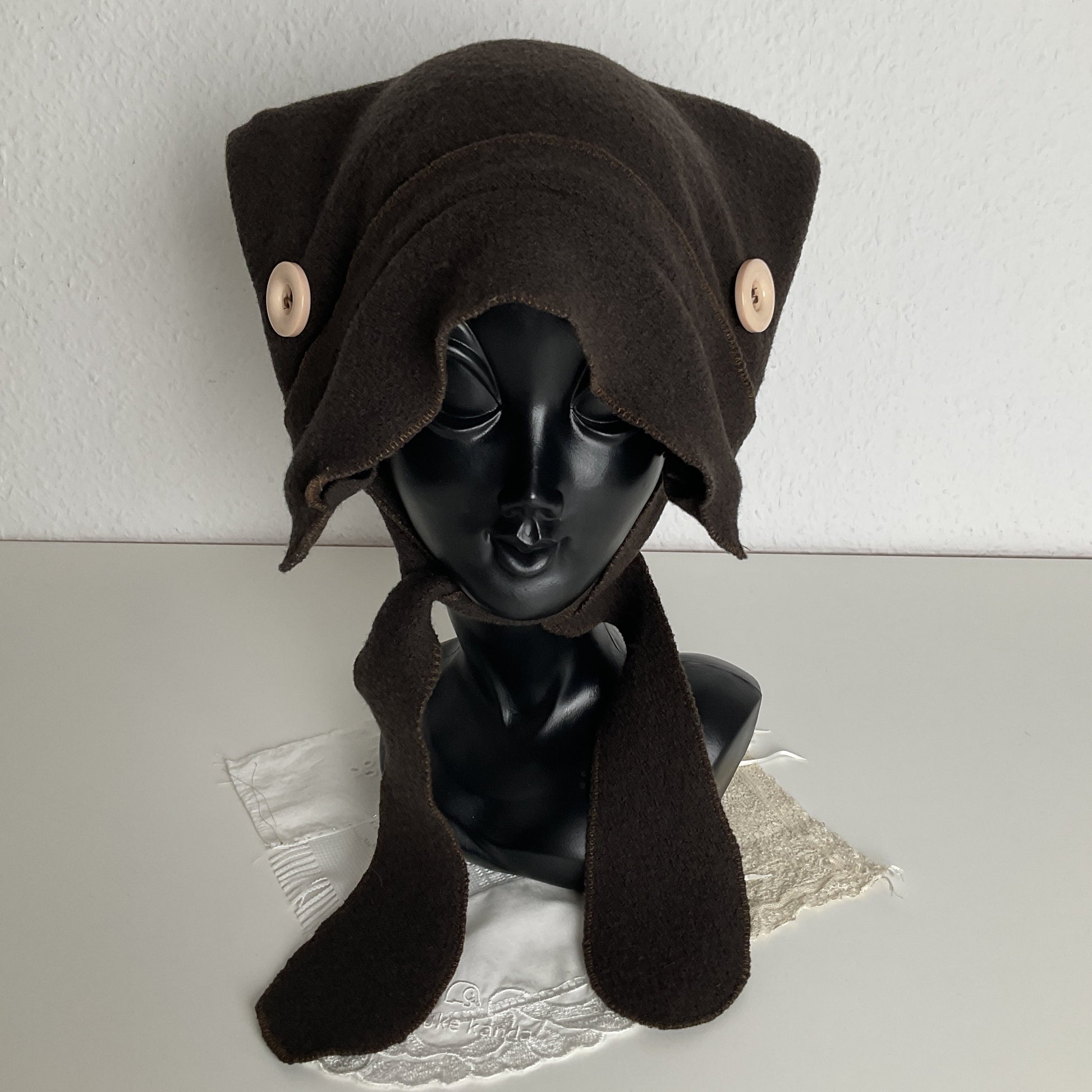 Pointy maiden bonnet in cozy virgin wool fabric.