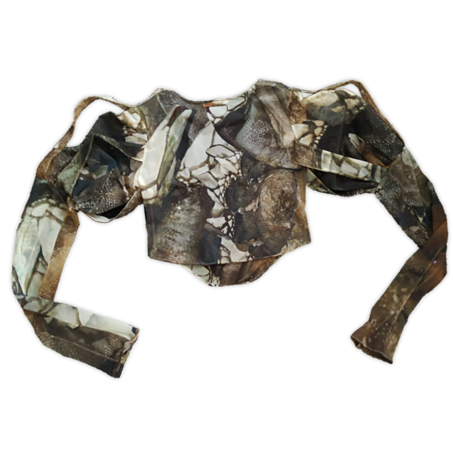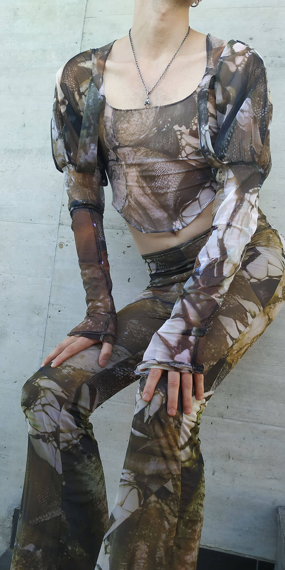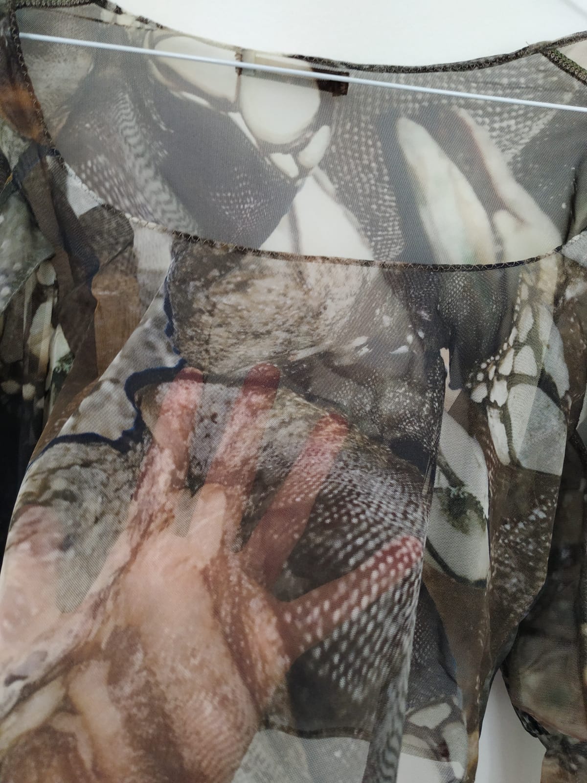 Single-layered mesh top with paned sleeves.