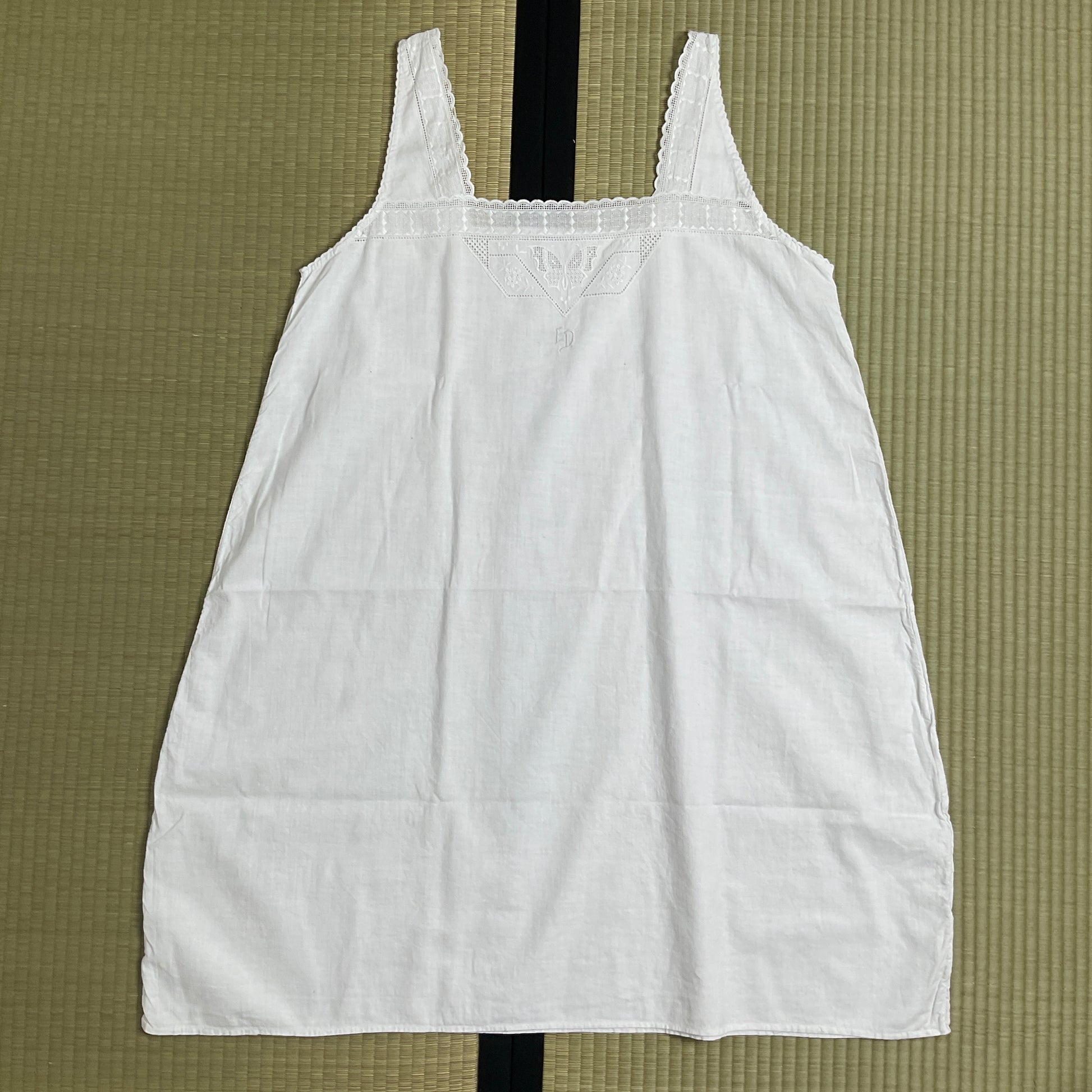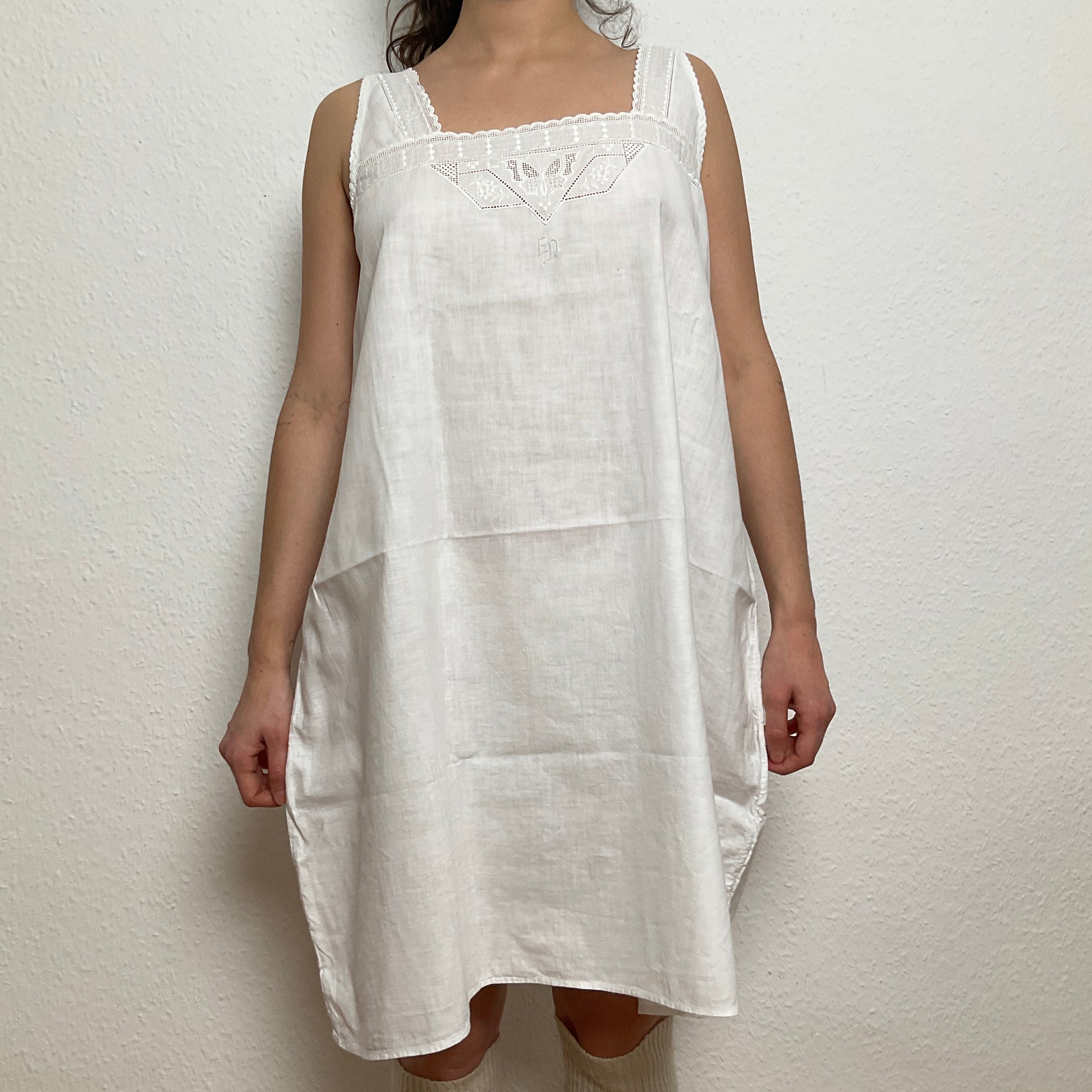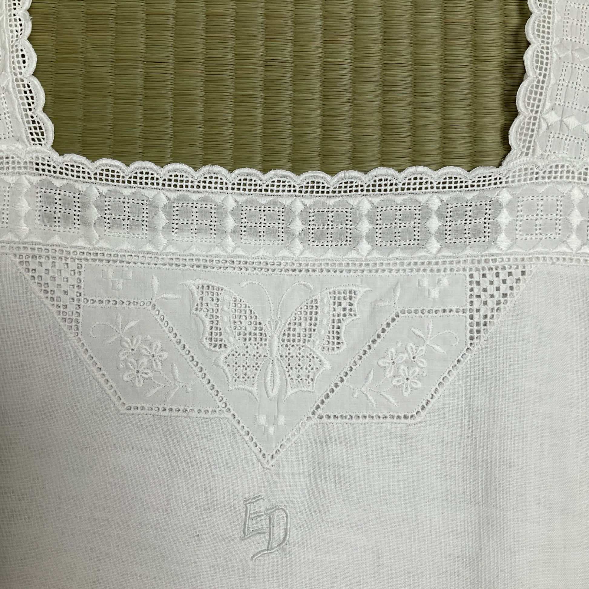 Antique nightgown in cotton/linen with exquisite butterfly lace embroidery.