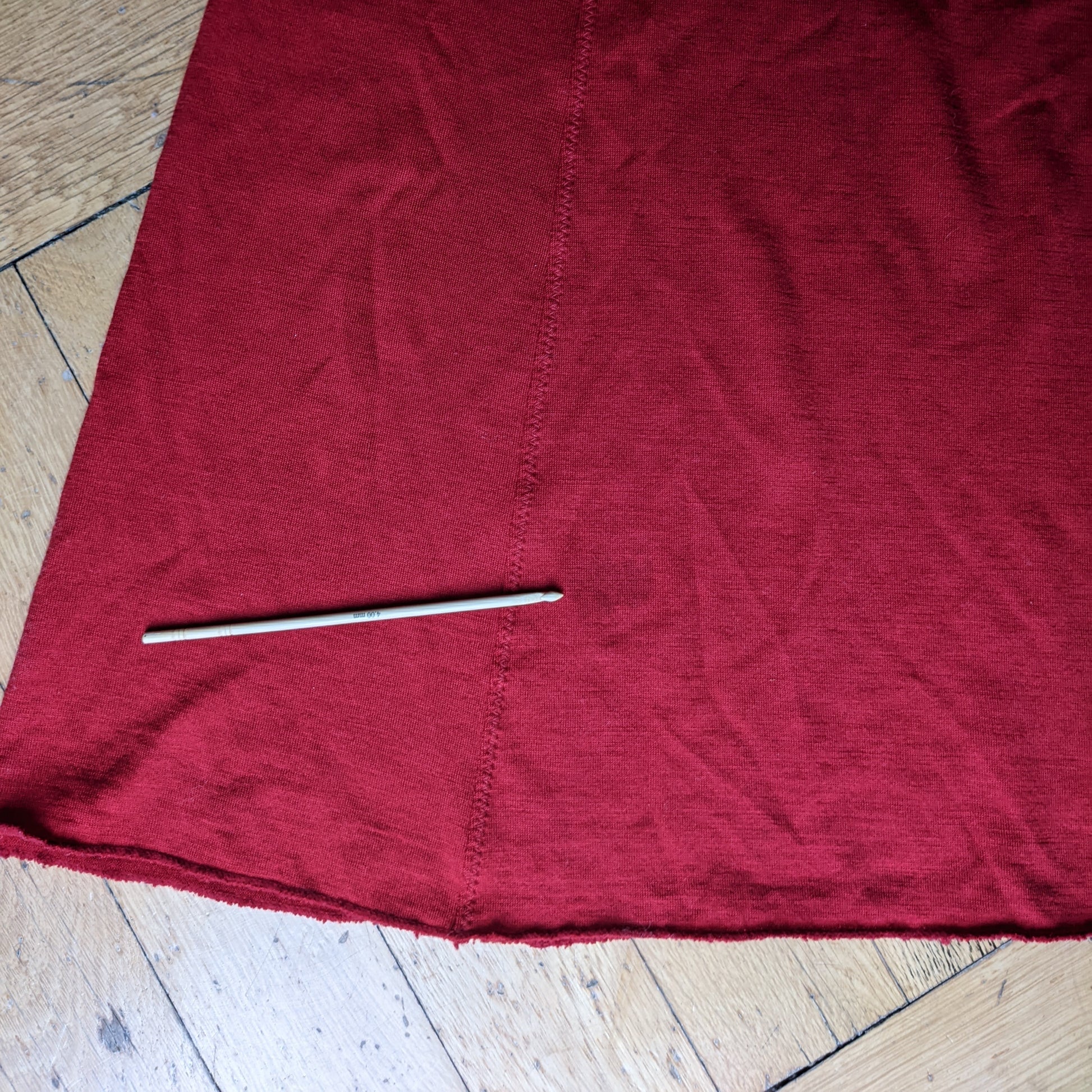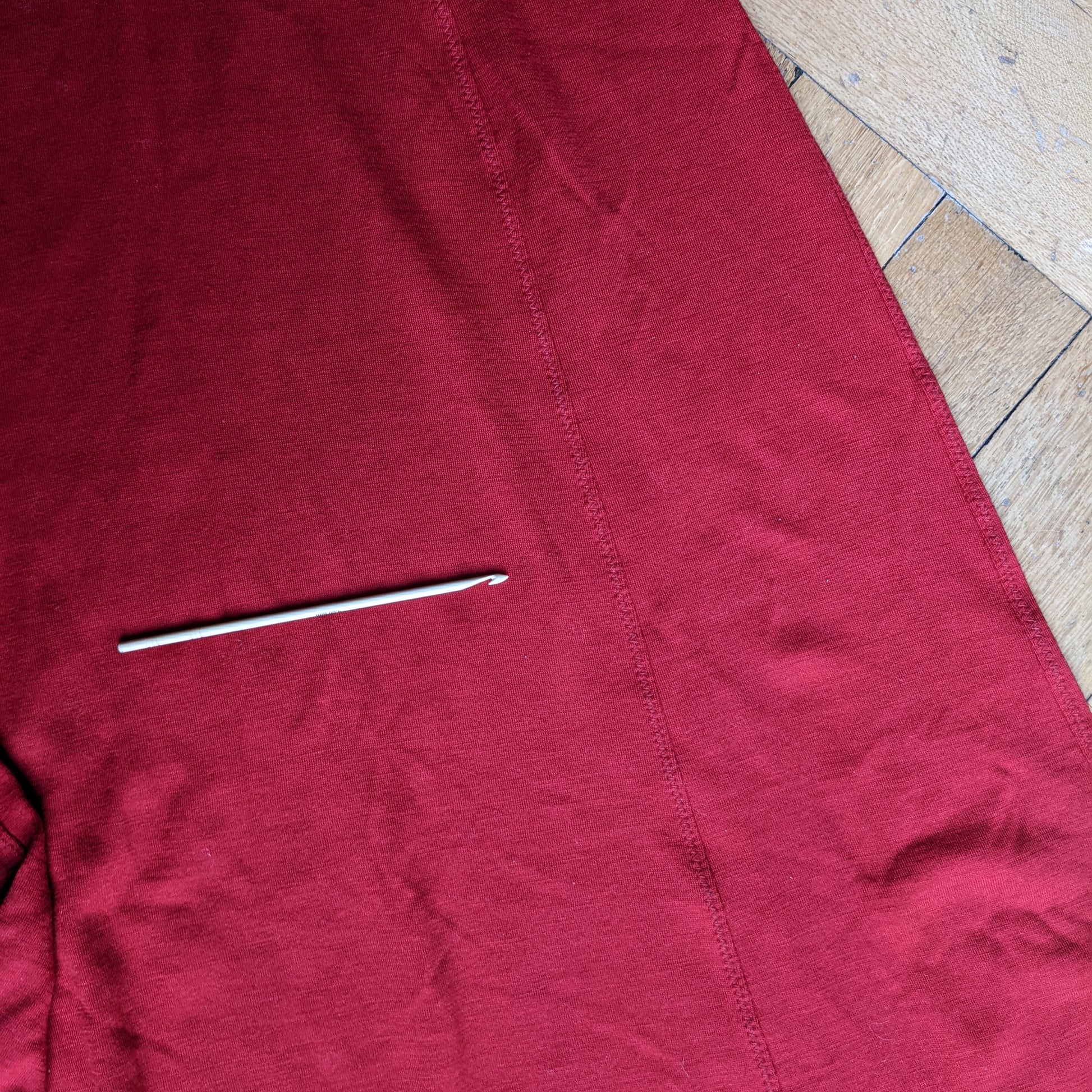 There are two faint dark red stains on the back, which might still come out in a careful handwashing. One is near the hem on the back of the dress and a smaller one is on the front under the middle. See the last pictures.