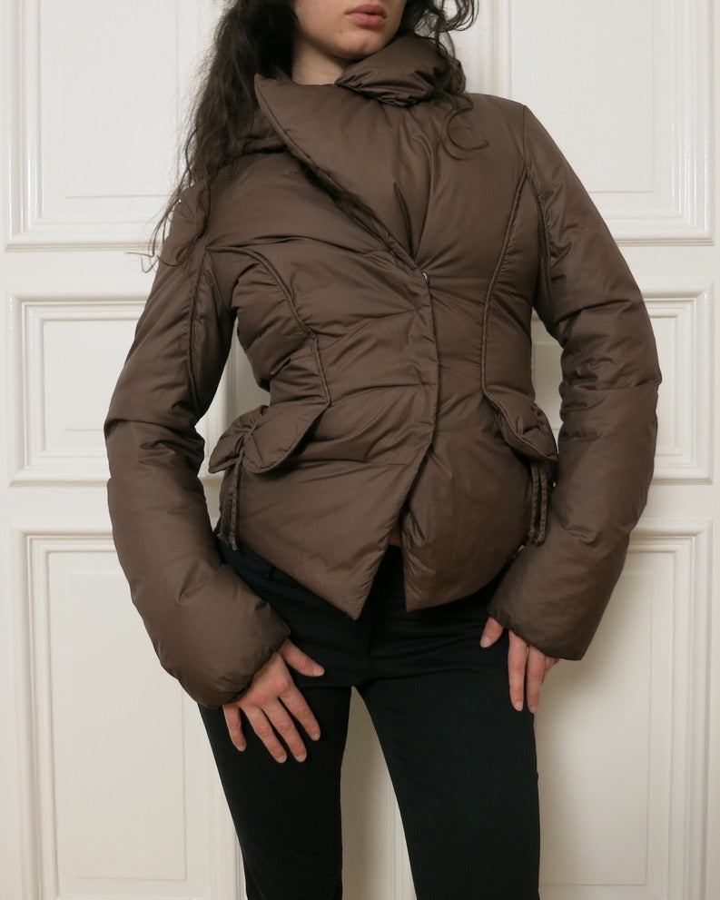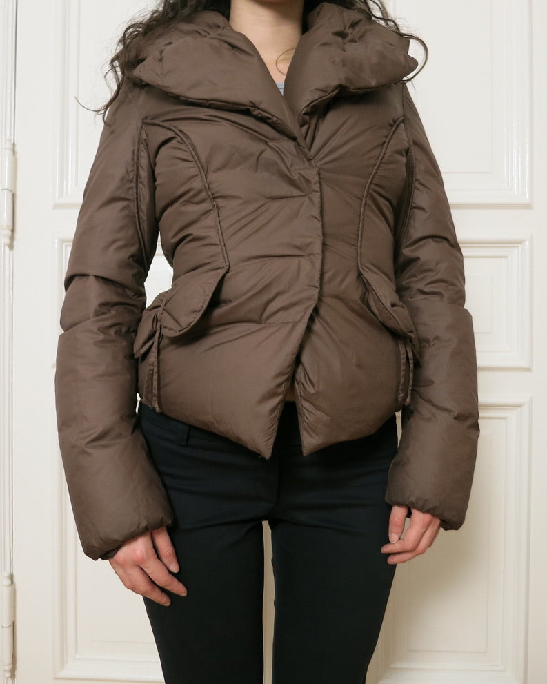 Brown goose down puffer with big collar. Outer fabric 100% polyester.