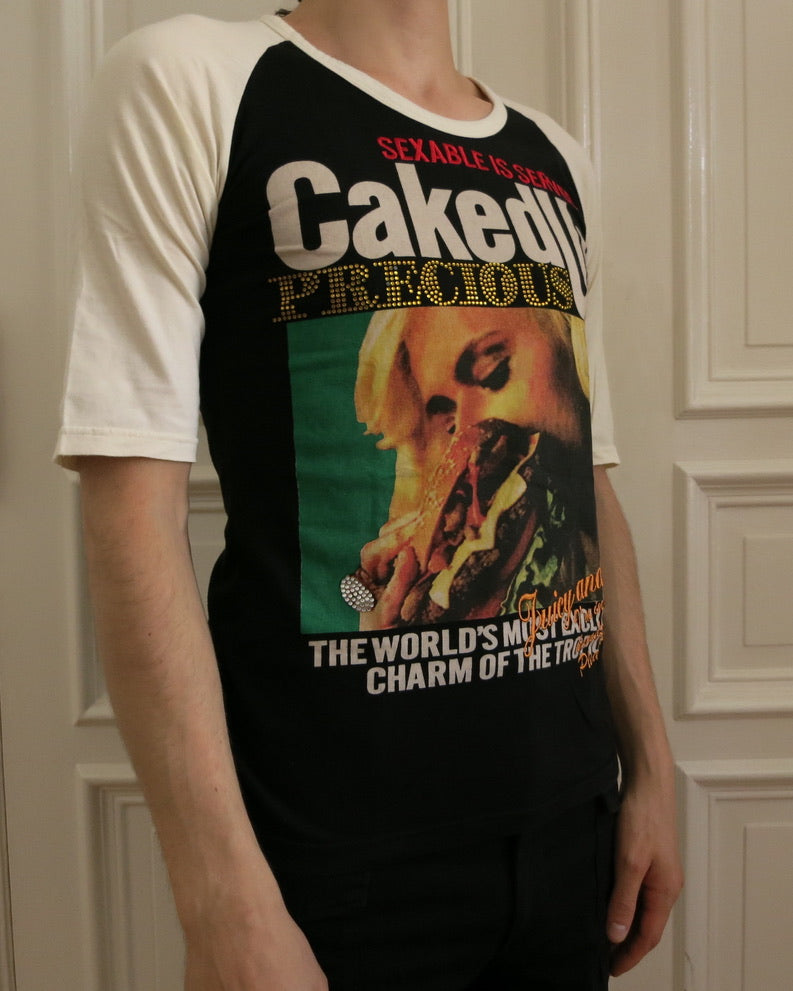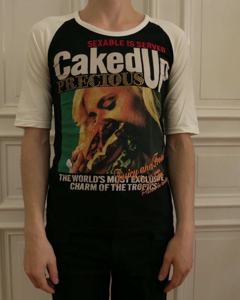 Baseball top with excessive print.