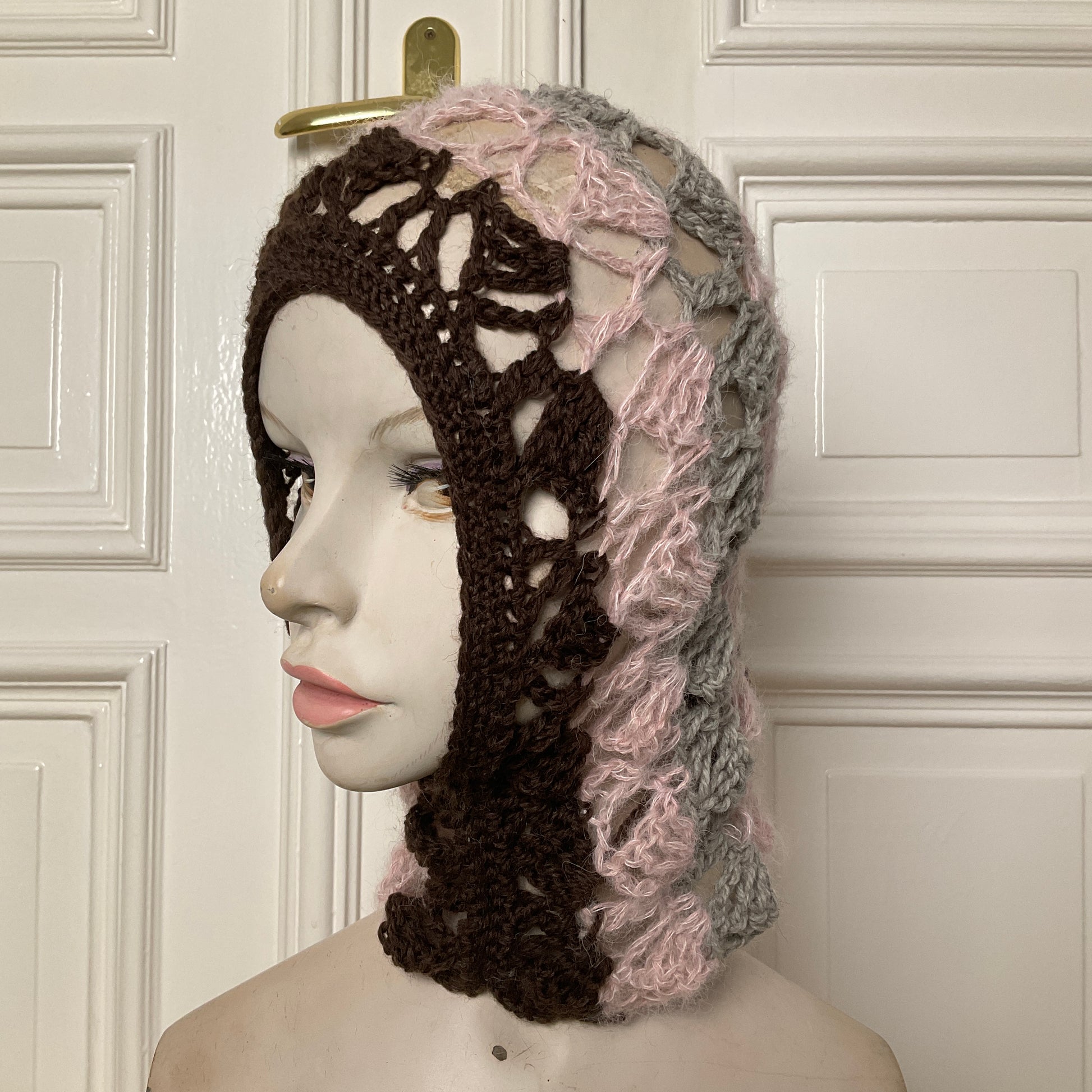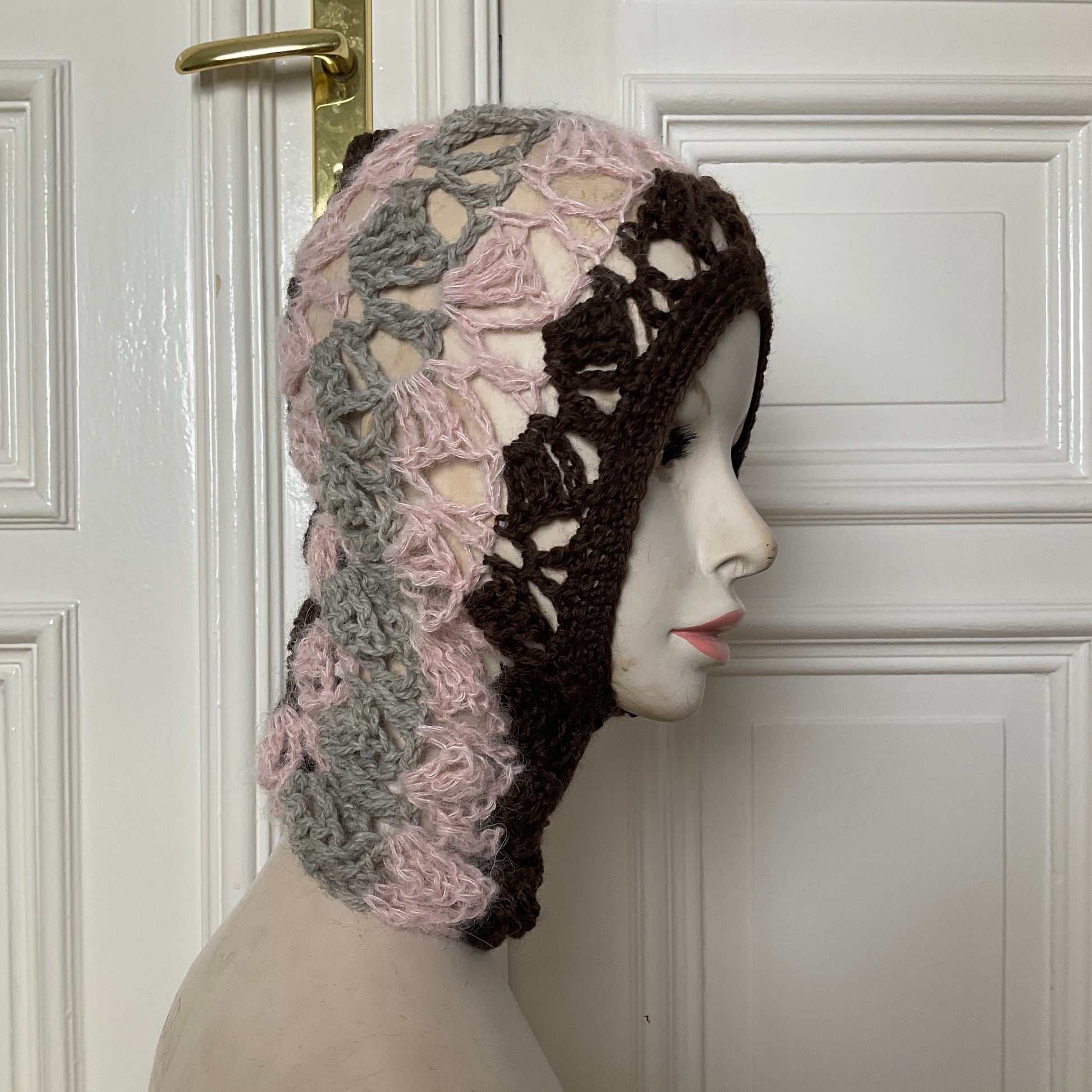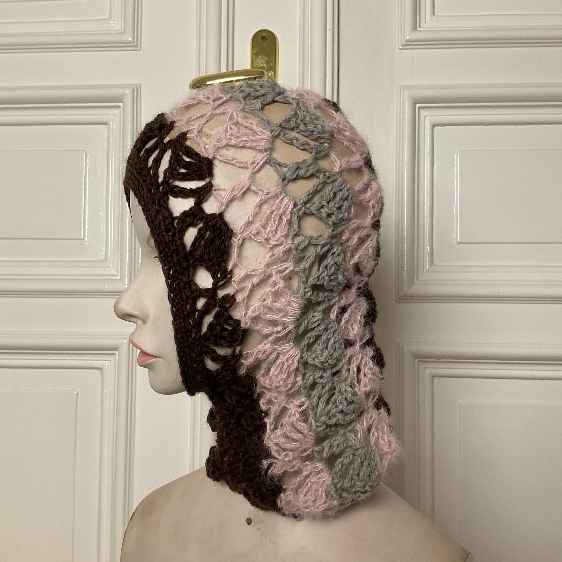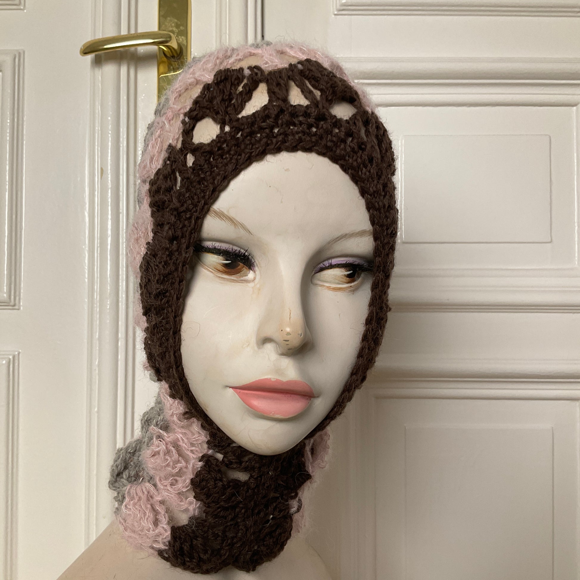 Cocoon nr. 2 crochet balaclava in brown, pink and grey. Handmade in Berlin by mođđe studio.