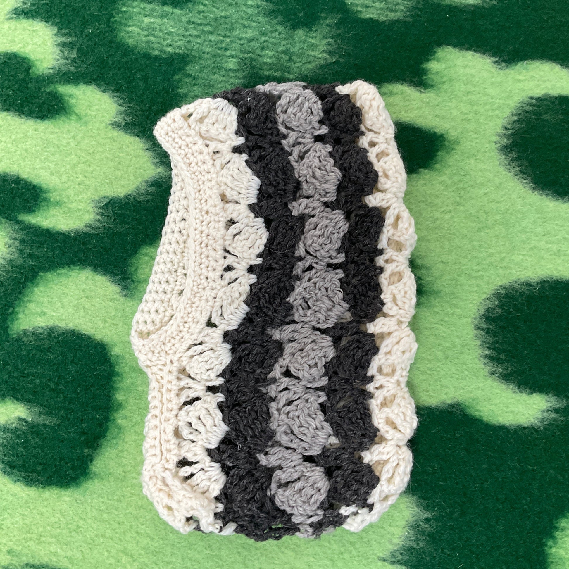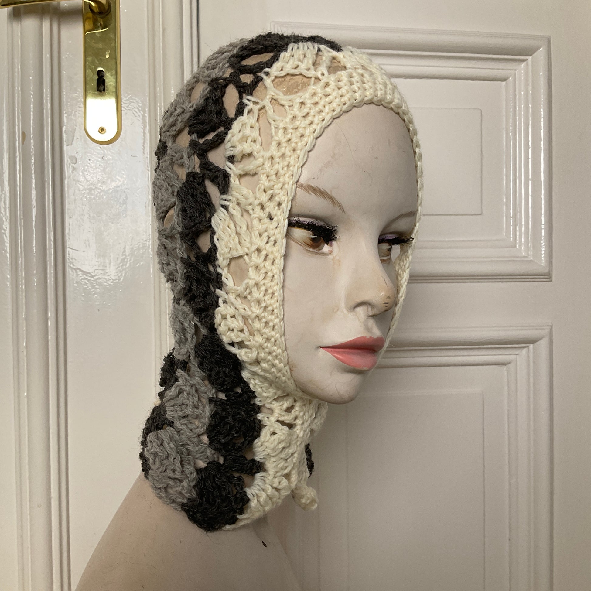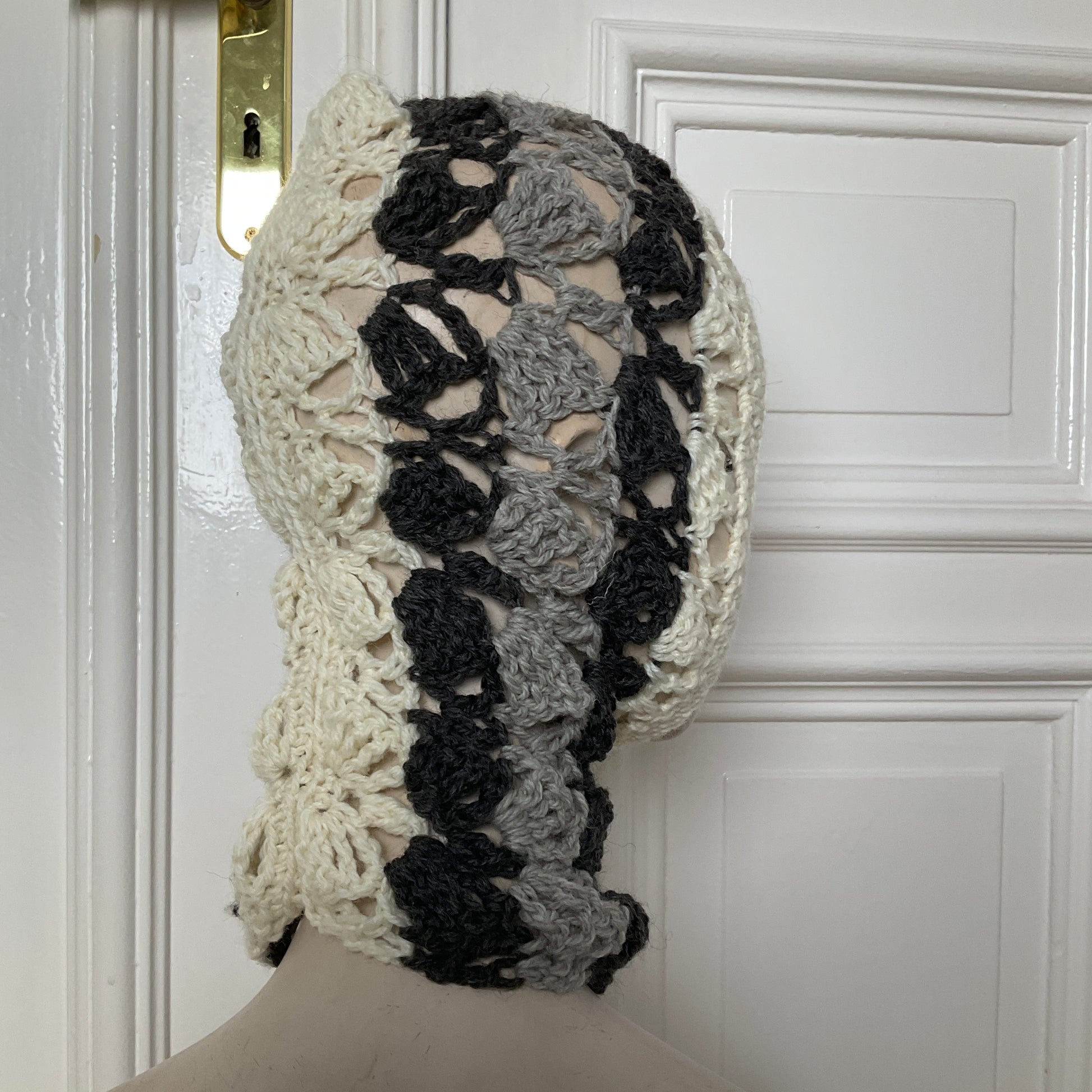 Cocoon nr. 2 crochet balaclava in white and grey. Handmade in Berlin by mođđe studio.