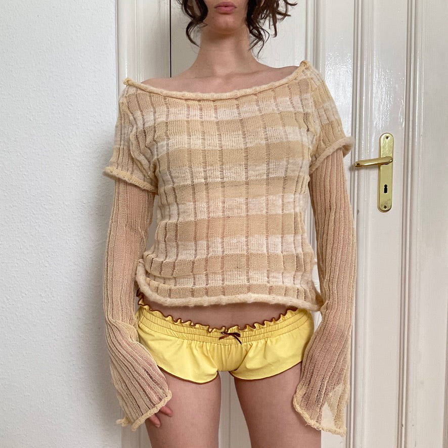 Handmade on a domestic knitting machine. Made of second hand yarn, one stripe cotton, one stripe cotton and mohair.