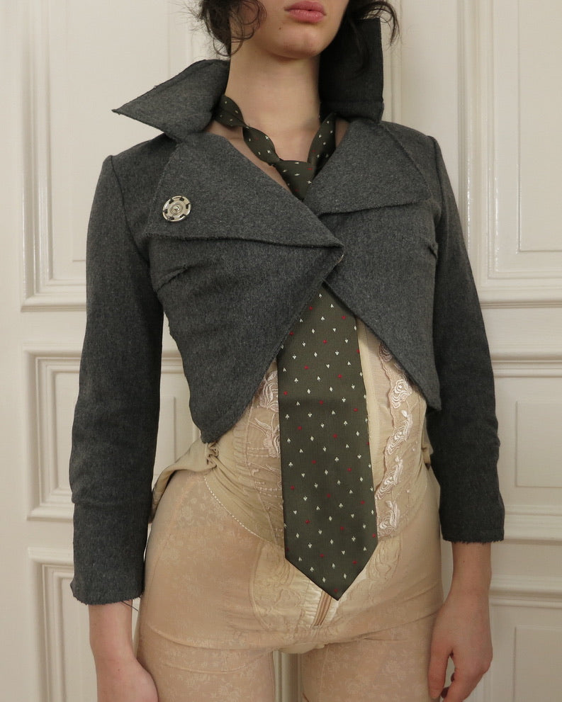 Cropped jacket from Patrizia Pepe. 77% wool, 20% polyester, 3% spandex.