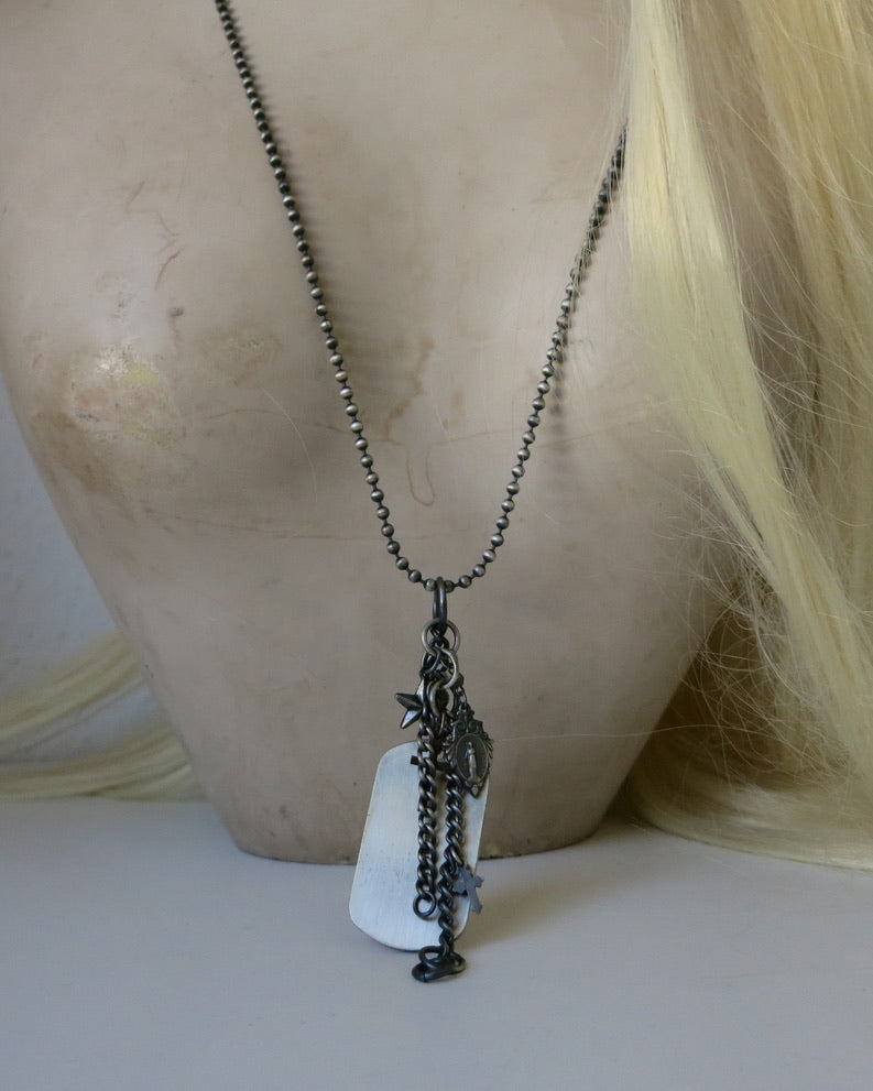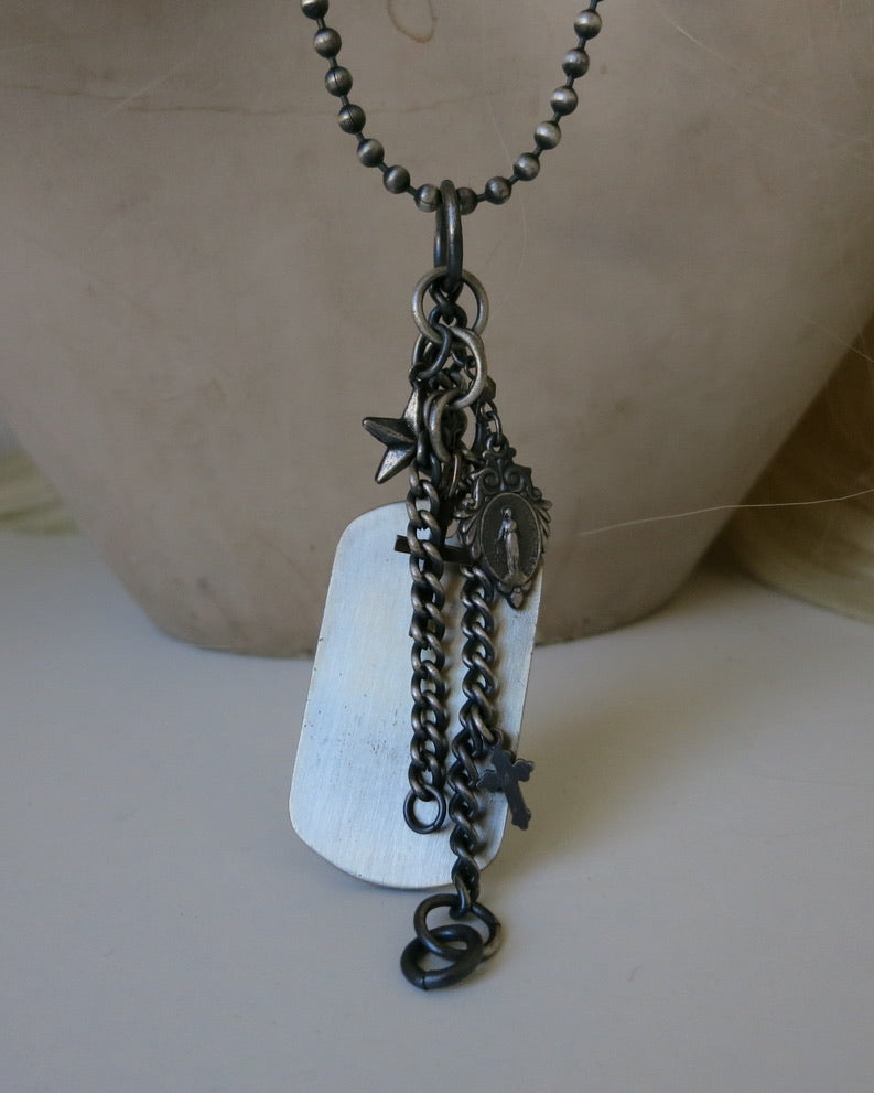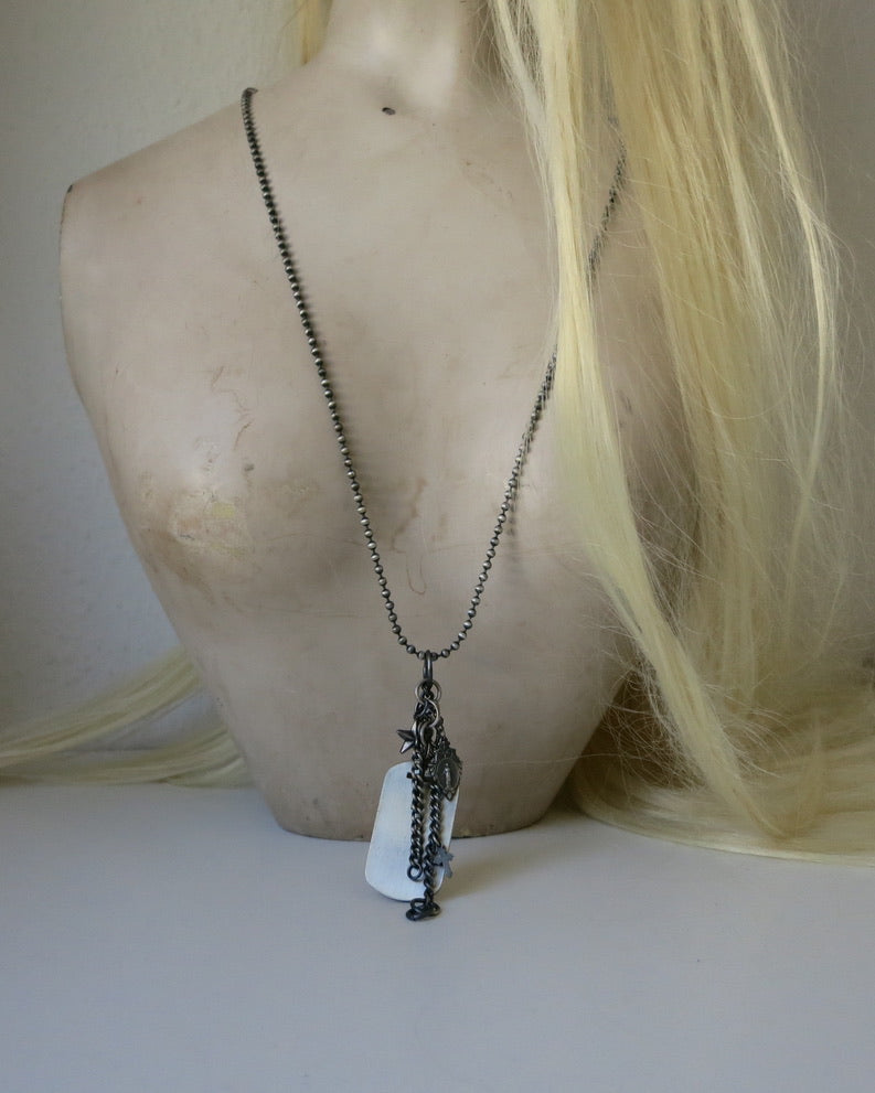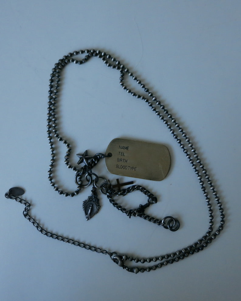 Long dog tag style metal necklace with various charms from 5351 Pour Les Hommes. Length adjustable from 82 to 92 cm.
