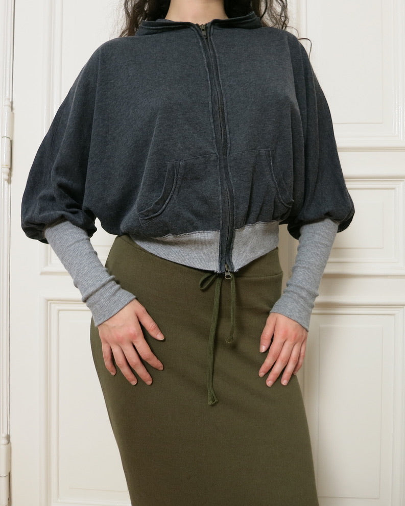 Main fabric 50% cotton, 50% polyester. Ribbing 85% cotton, 15% angora.