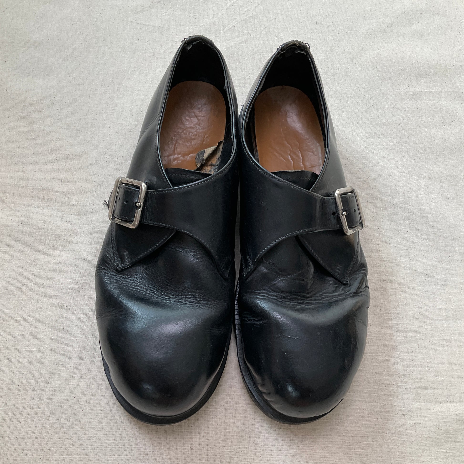 In good used condition considering the age. Sole is in excellent condition. There is some wear on the elastic straps that hold the buckles, they might eventually need to be replaced by a shoemaker.