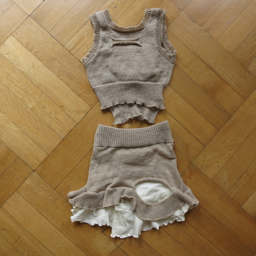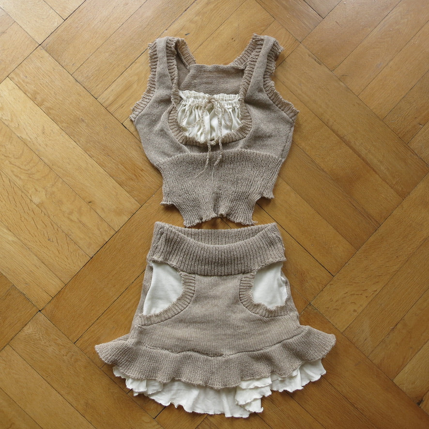 Knit two piece corset top and miniskirt set in 100% cashmere, with cotton details.