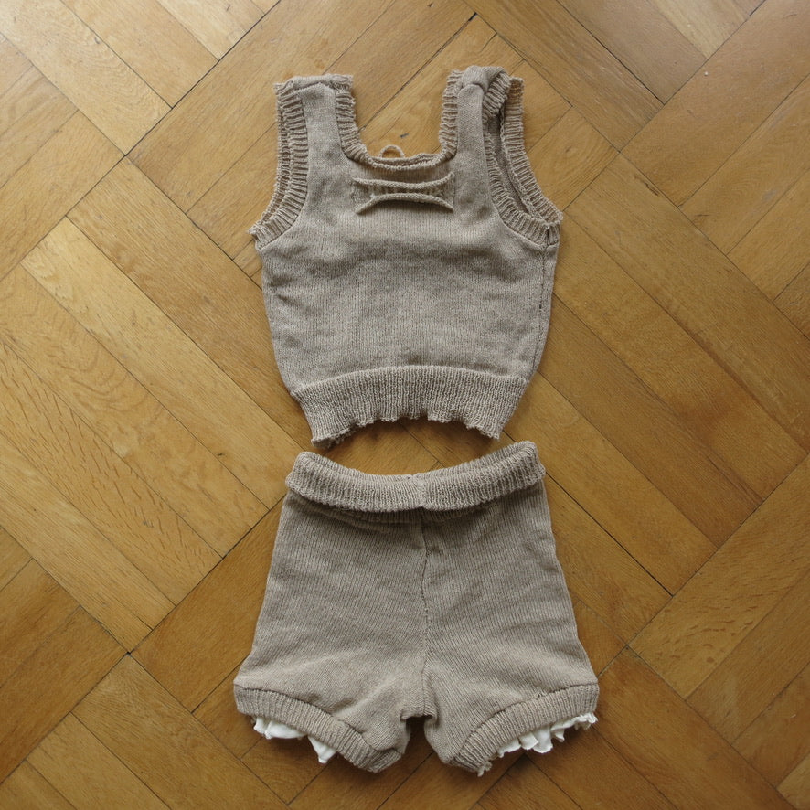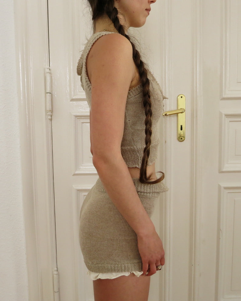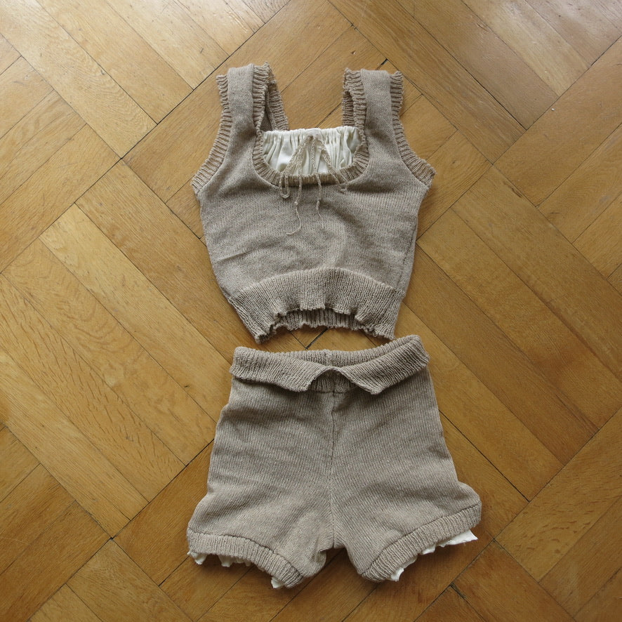 Knit two piece top and shorts set in 100% cashmere, with cotton details.