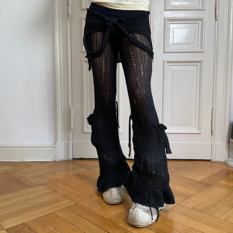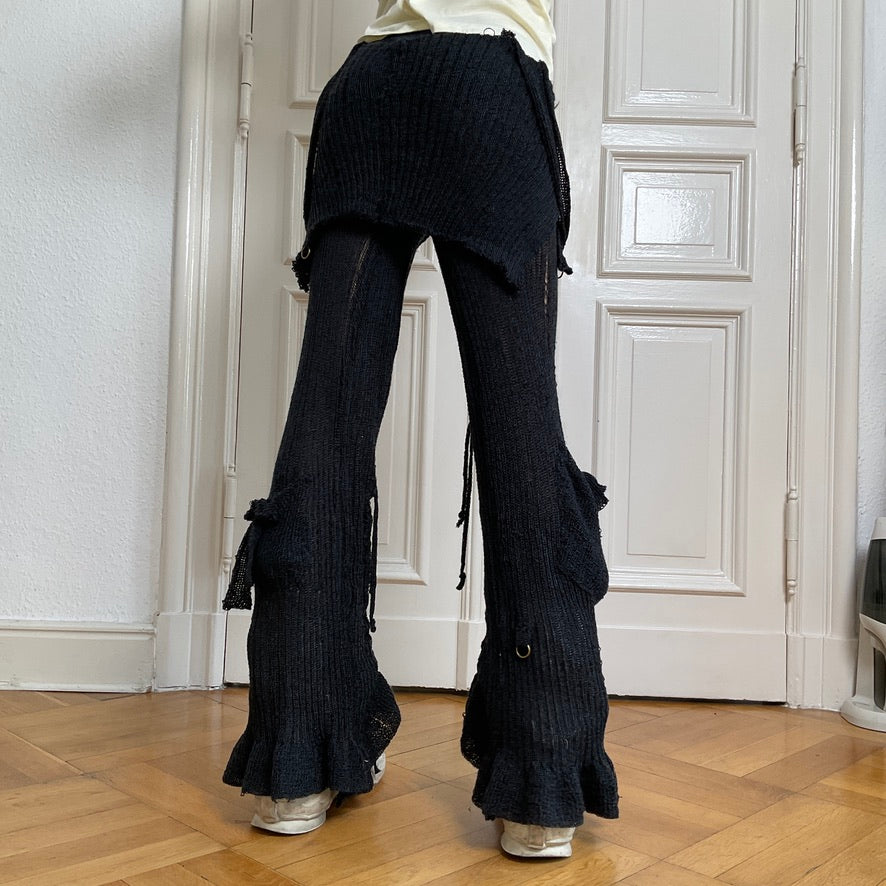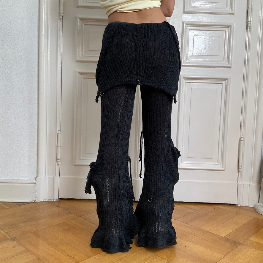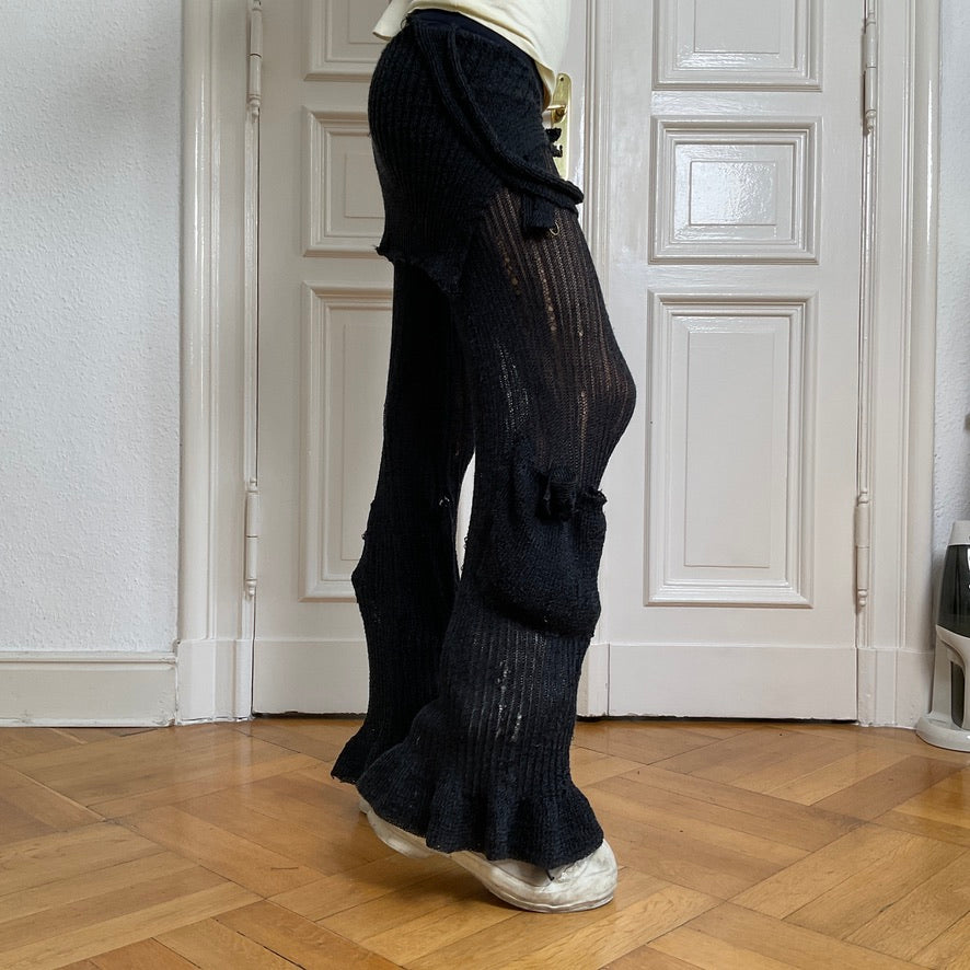 Gift wrapped flared cargo pants knit from black cotton/cotton mix yarn.