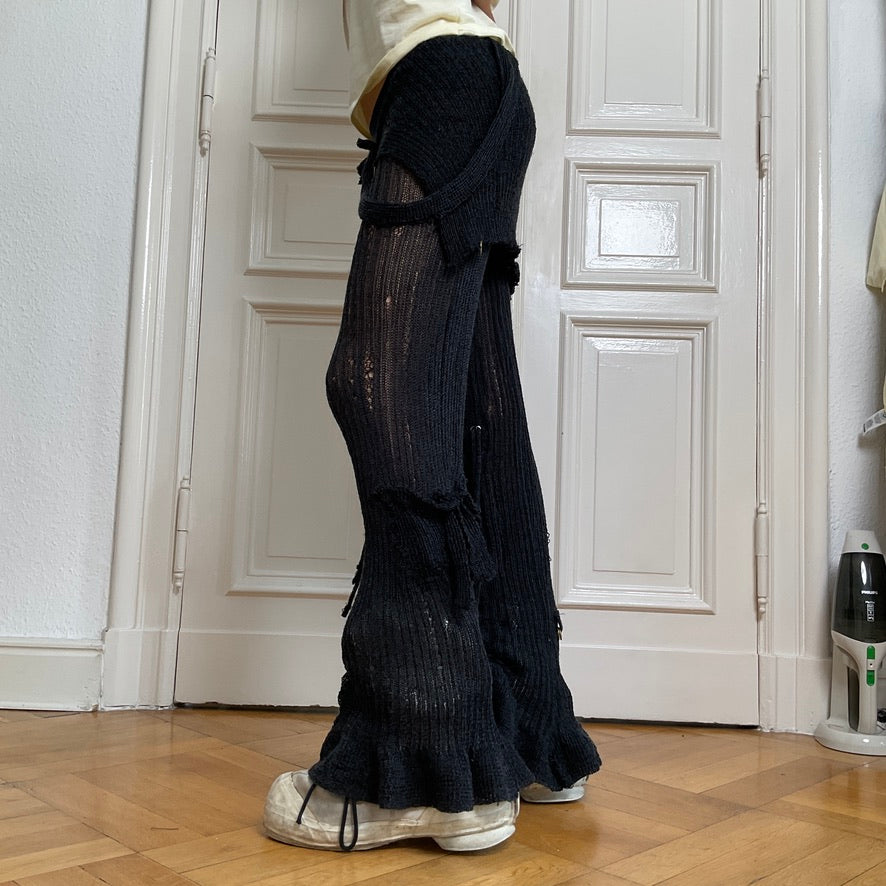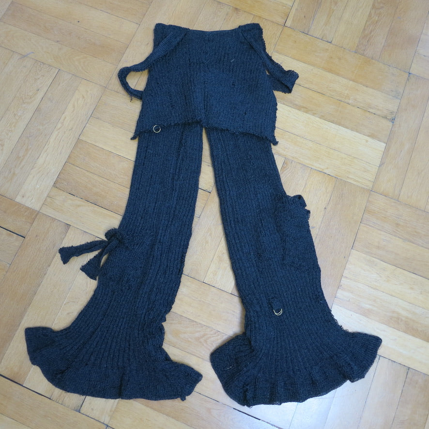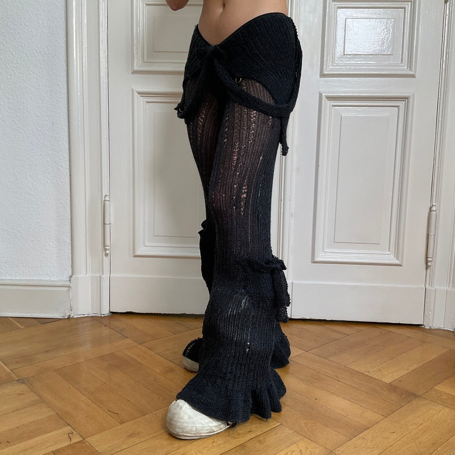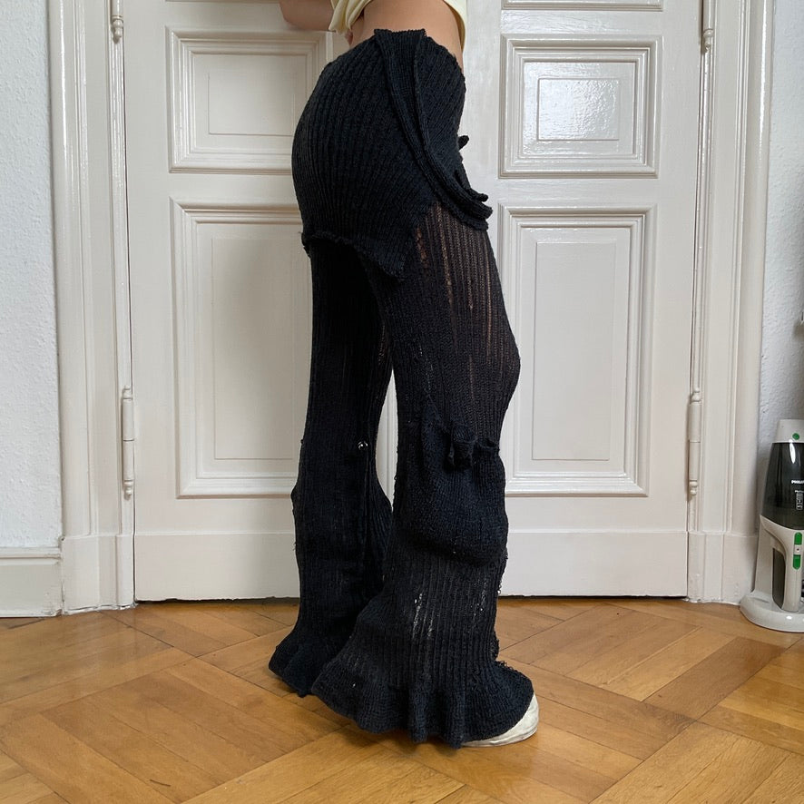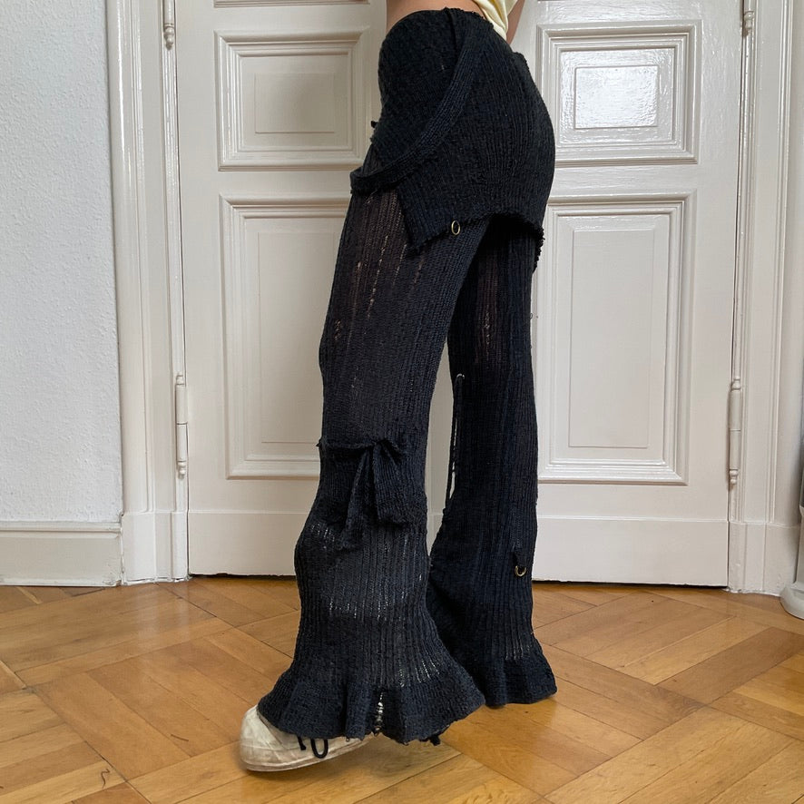 Gift wrapped flared cargo pants knit from black cotton/cotton mix yarn.