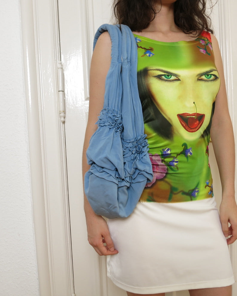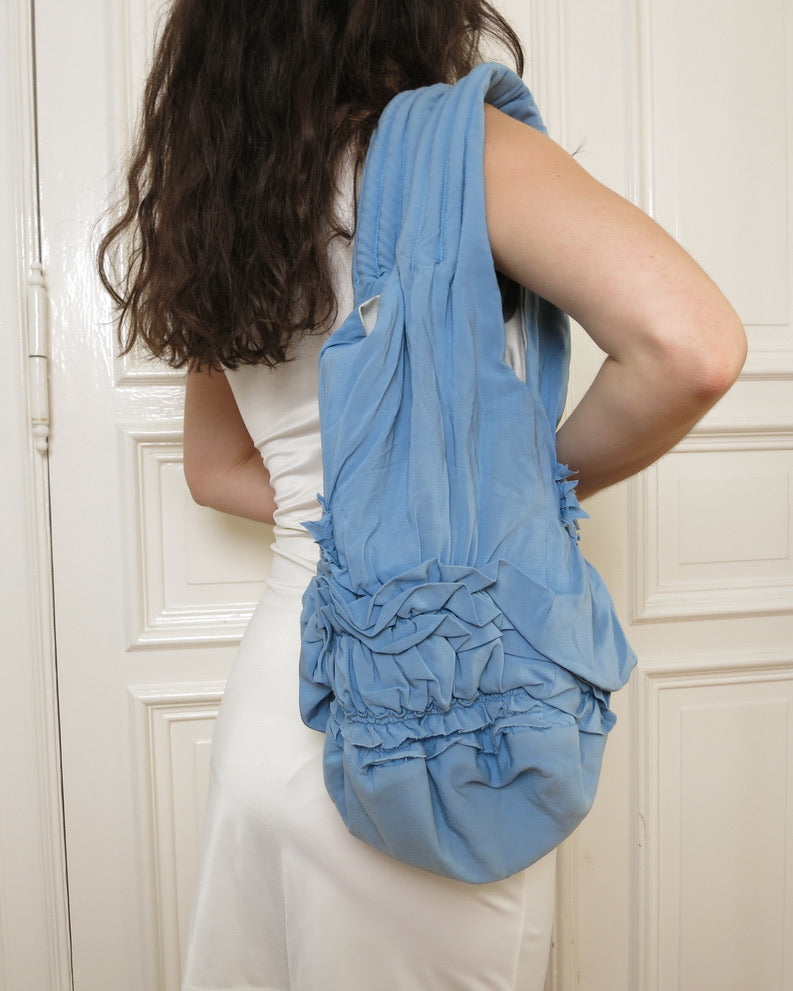 Sturdy tote bag from Gomme with gatherings and ruffle details. Closes with a button and has one big internal chamber and one small pocket. The outer layer is a light cotton or viscose, the inside is canvas.