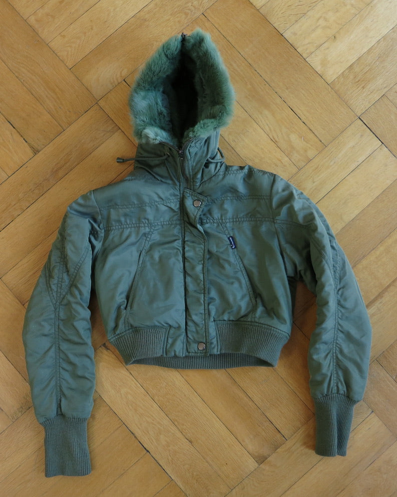 Bomber jacket with hood. The hood is lined with faux fur, and can be split into a collar with a zipper.