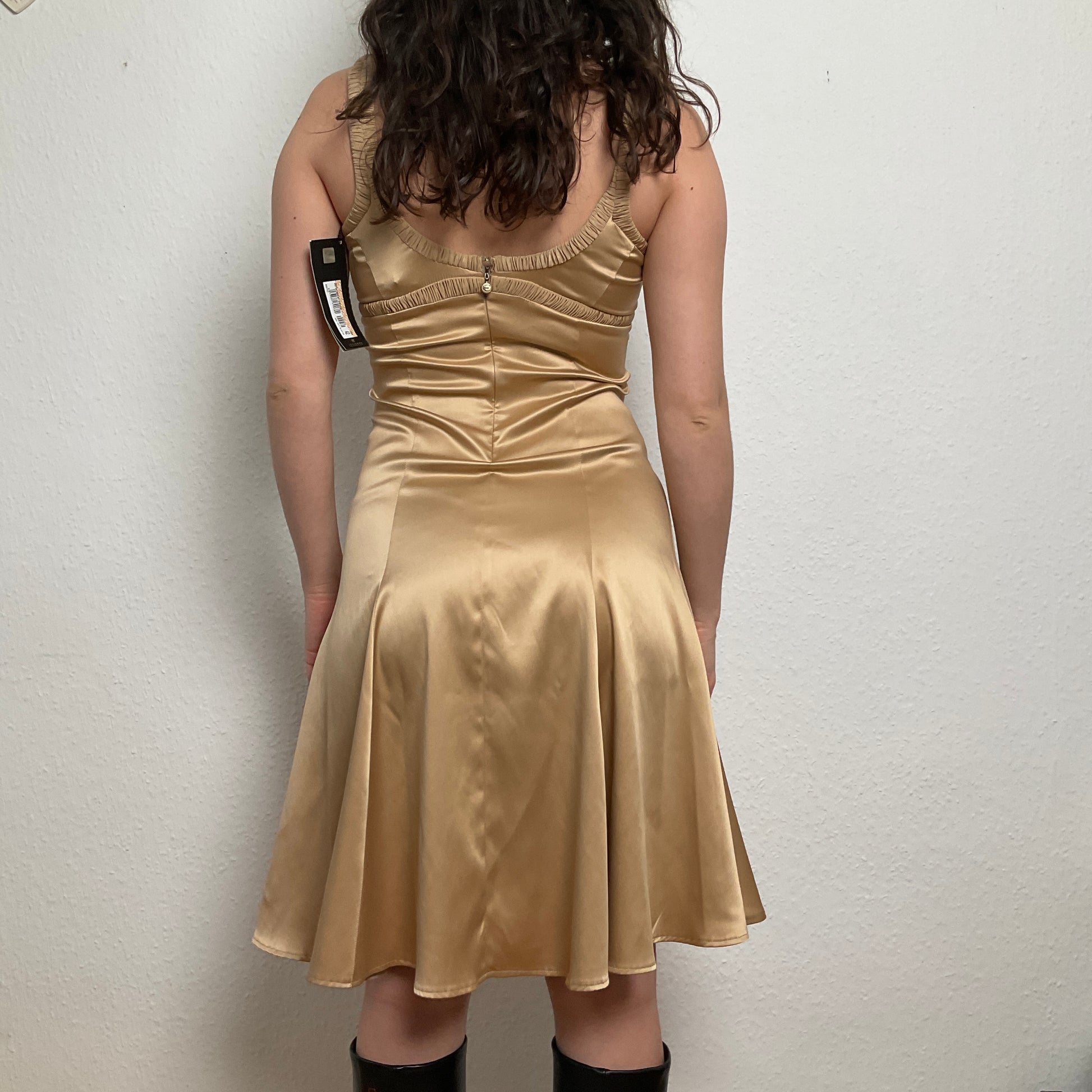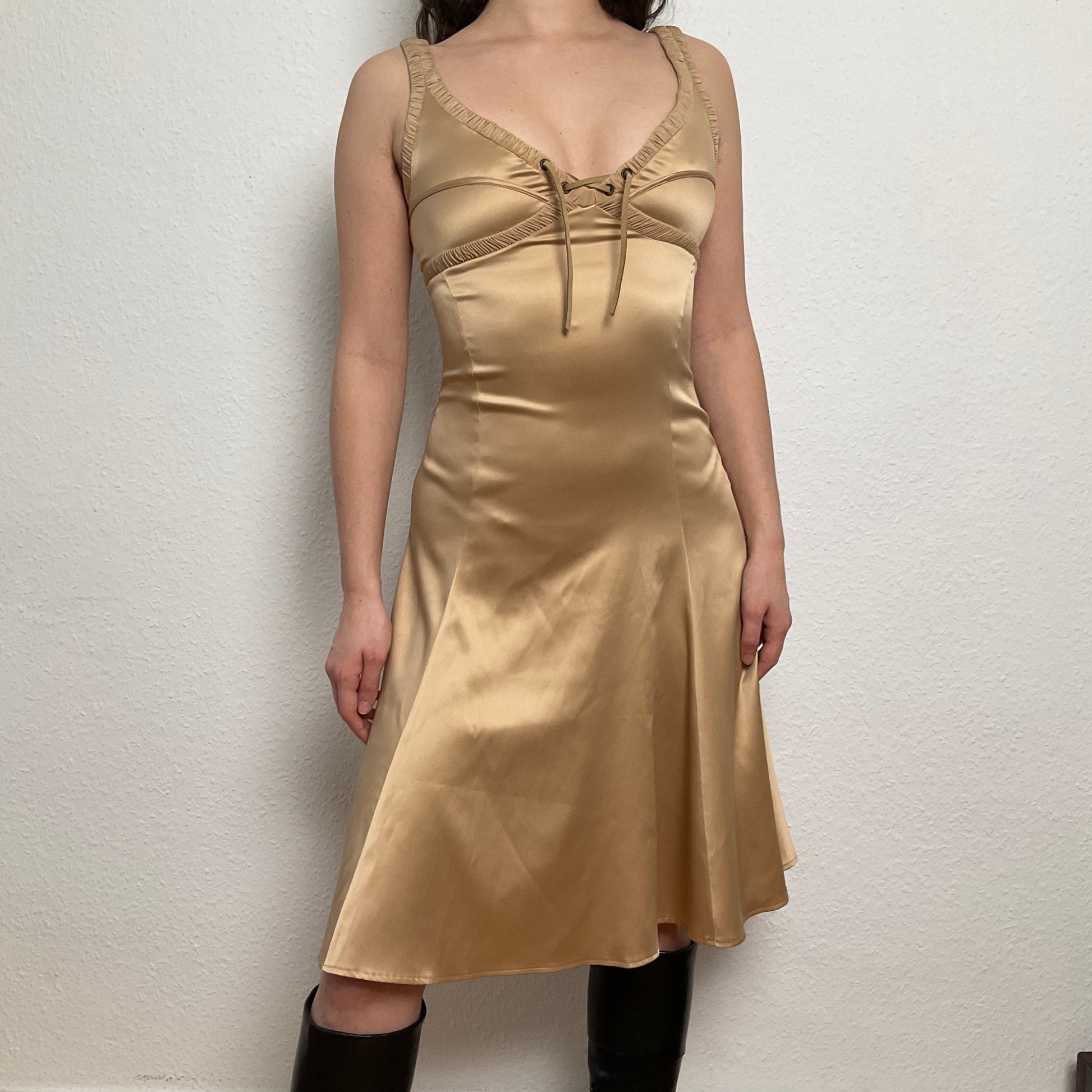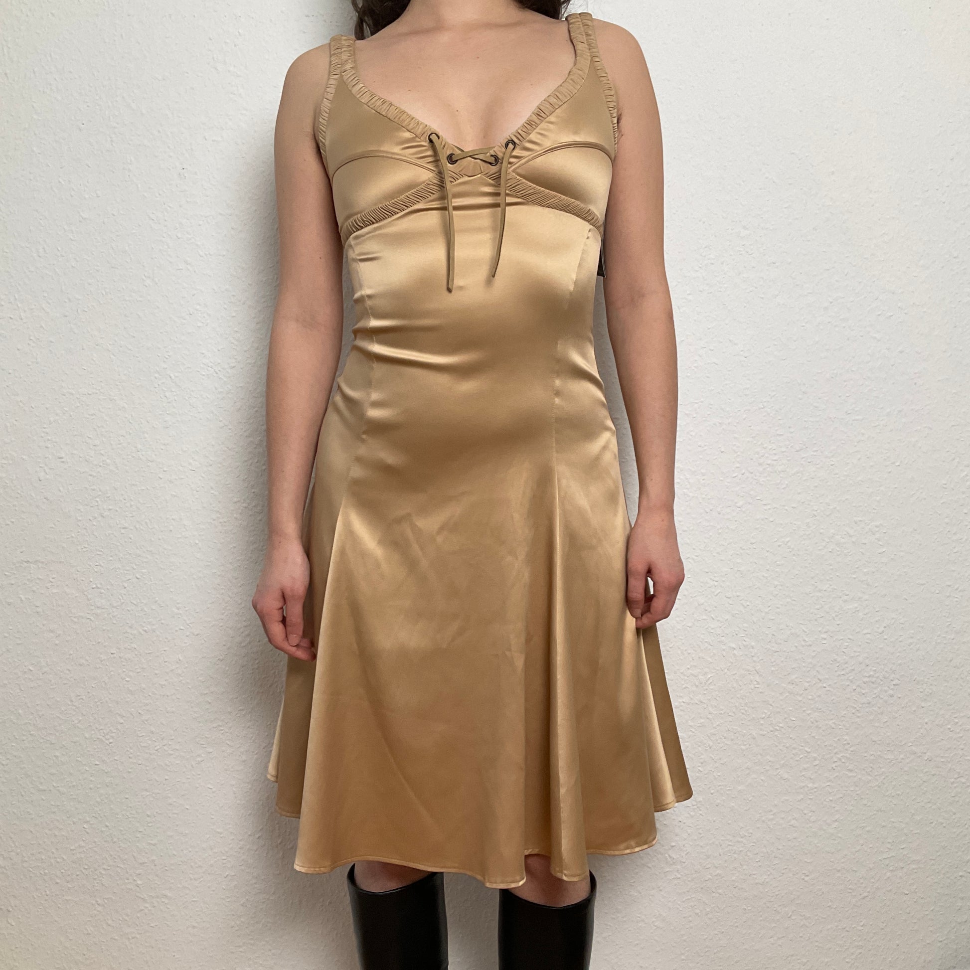 Just Cavalli golden dress with lacing in the front, with perfect fit and very flattering. Never used with original tag.