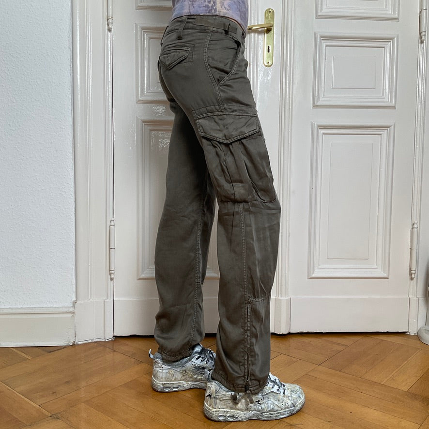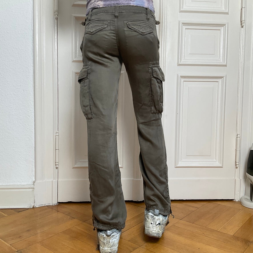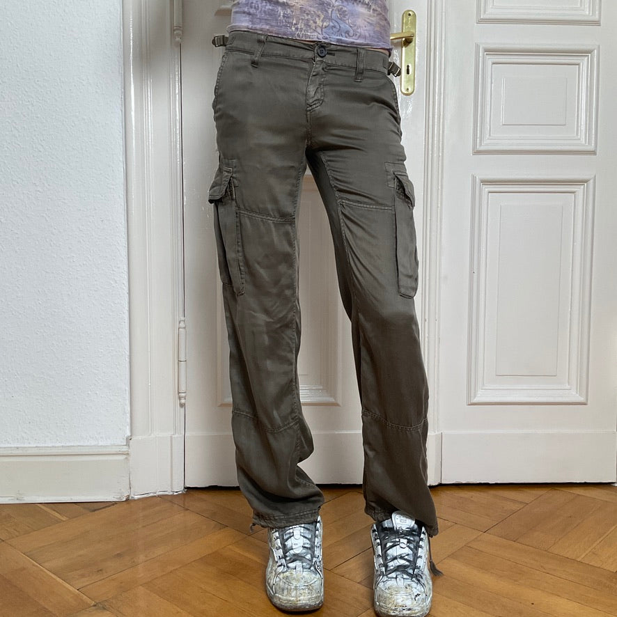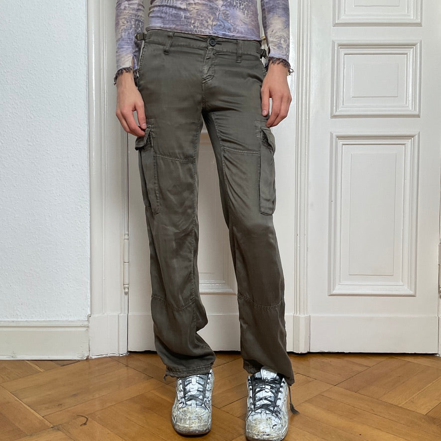 Shiny olive cargo pants from Masculo. There is a zipper at the hem so the pants can be made more flared, or gathered with strings.