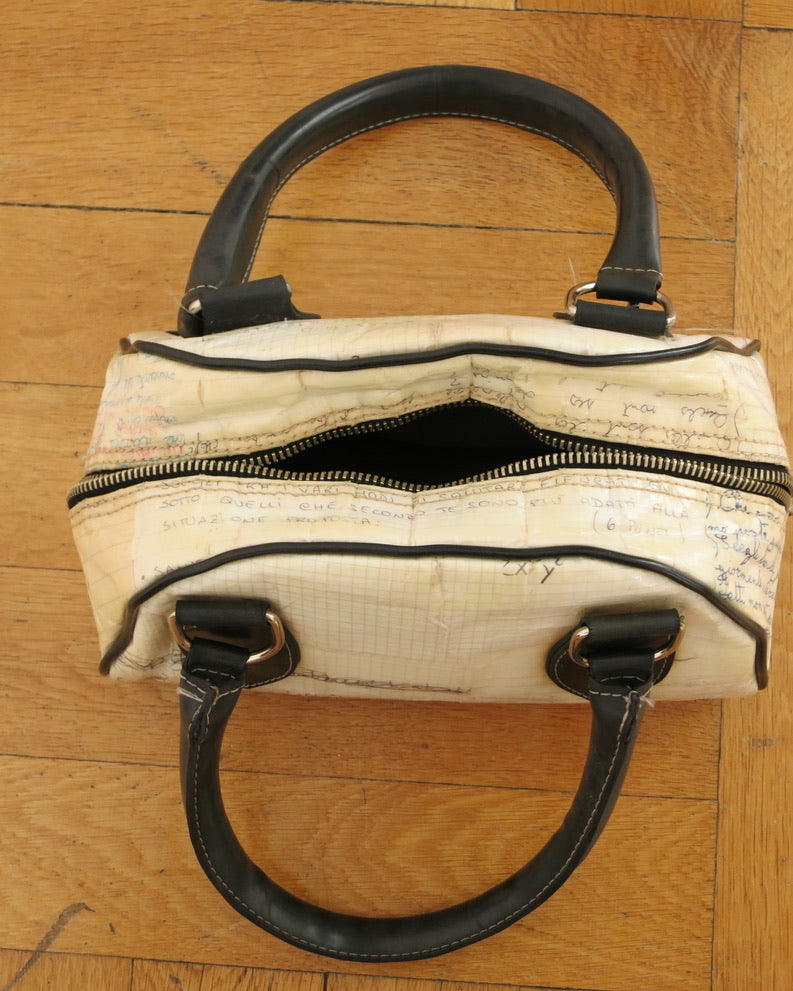 Handbag made from plastic bound notebook pages. In good used condition.