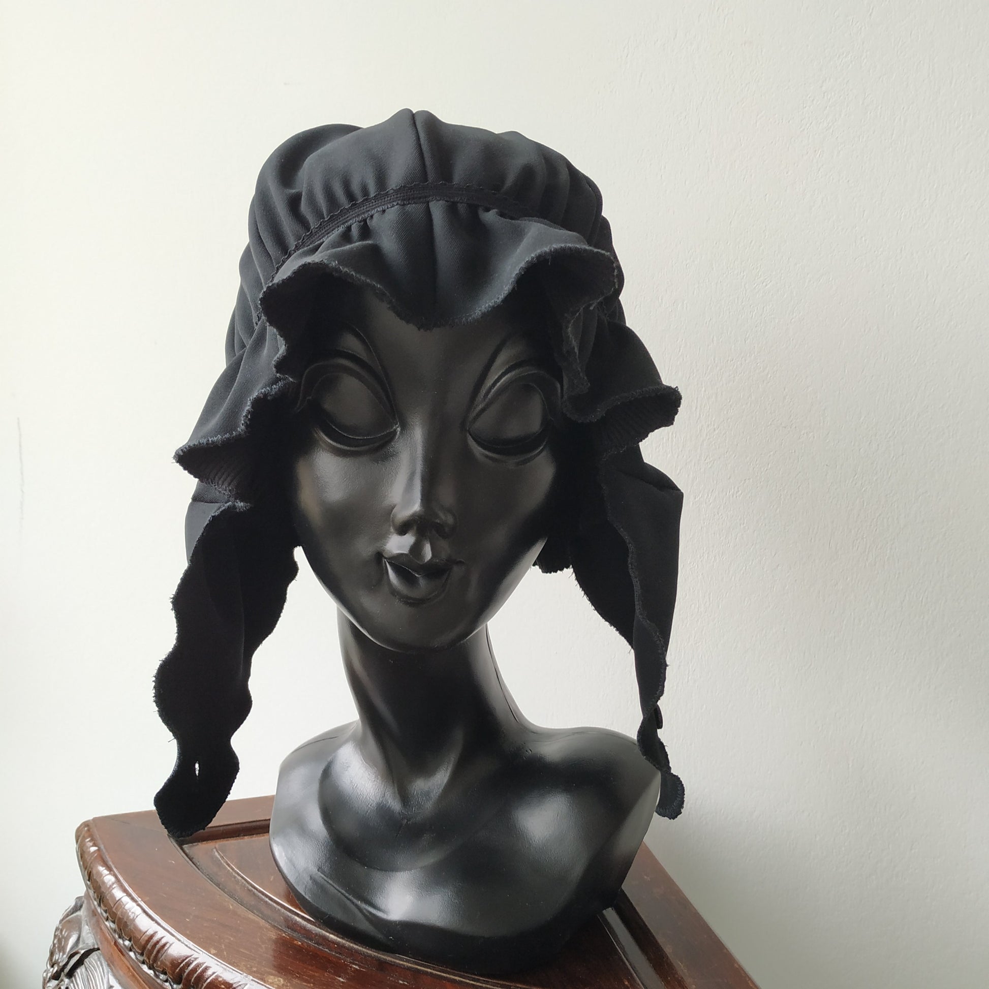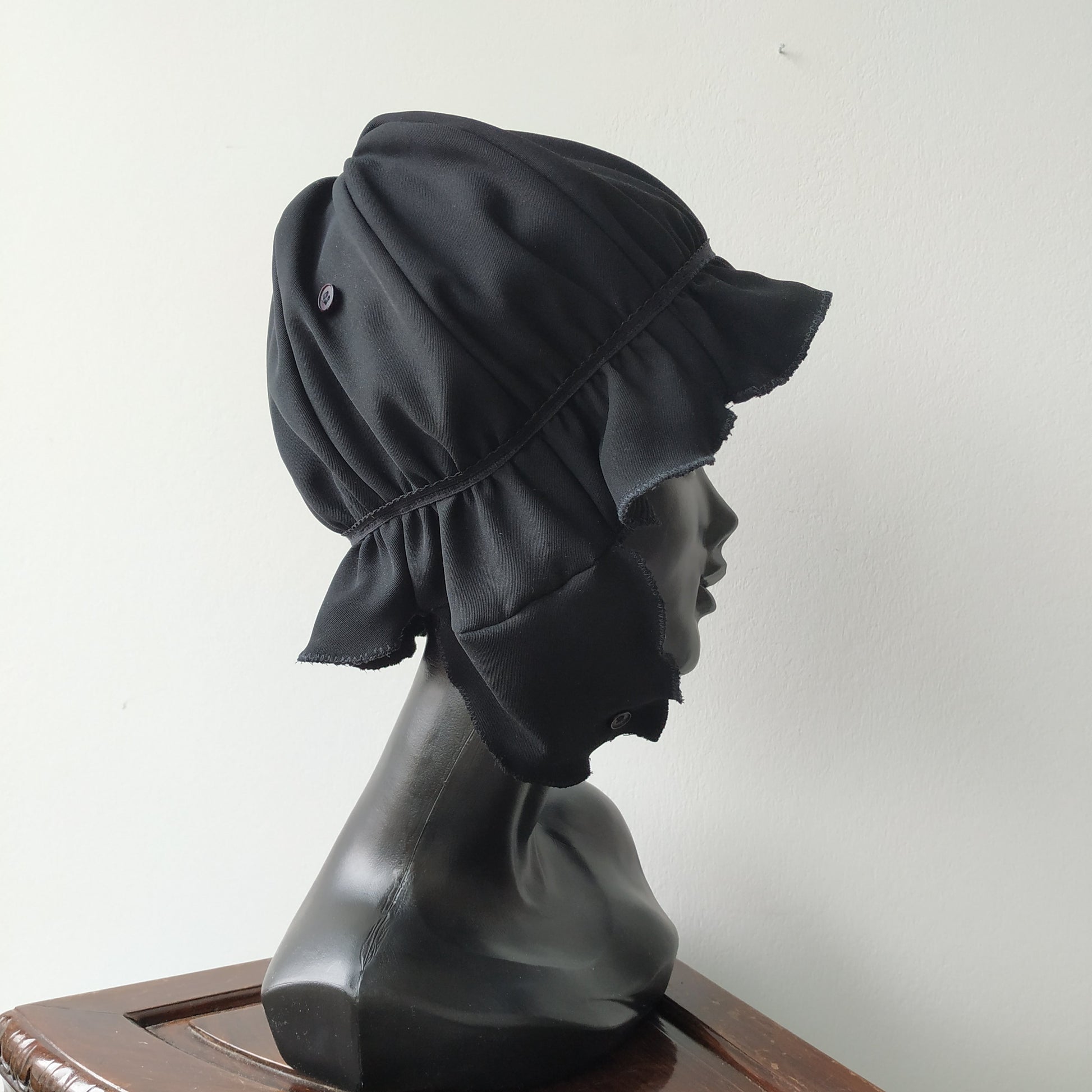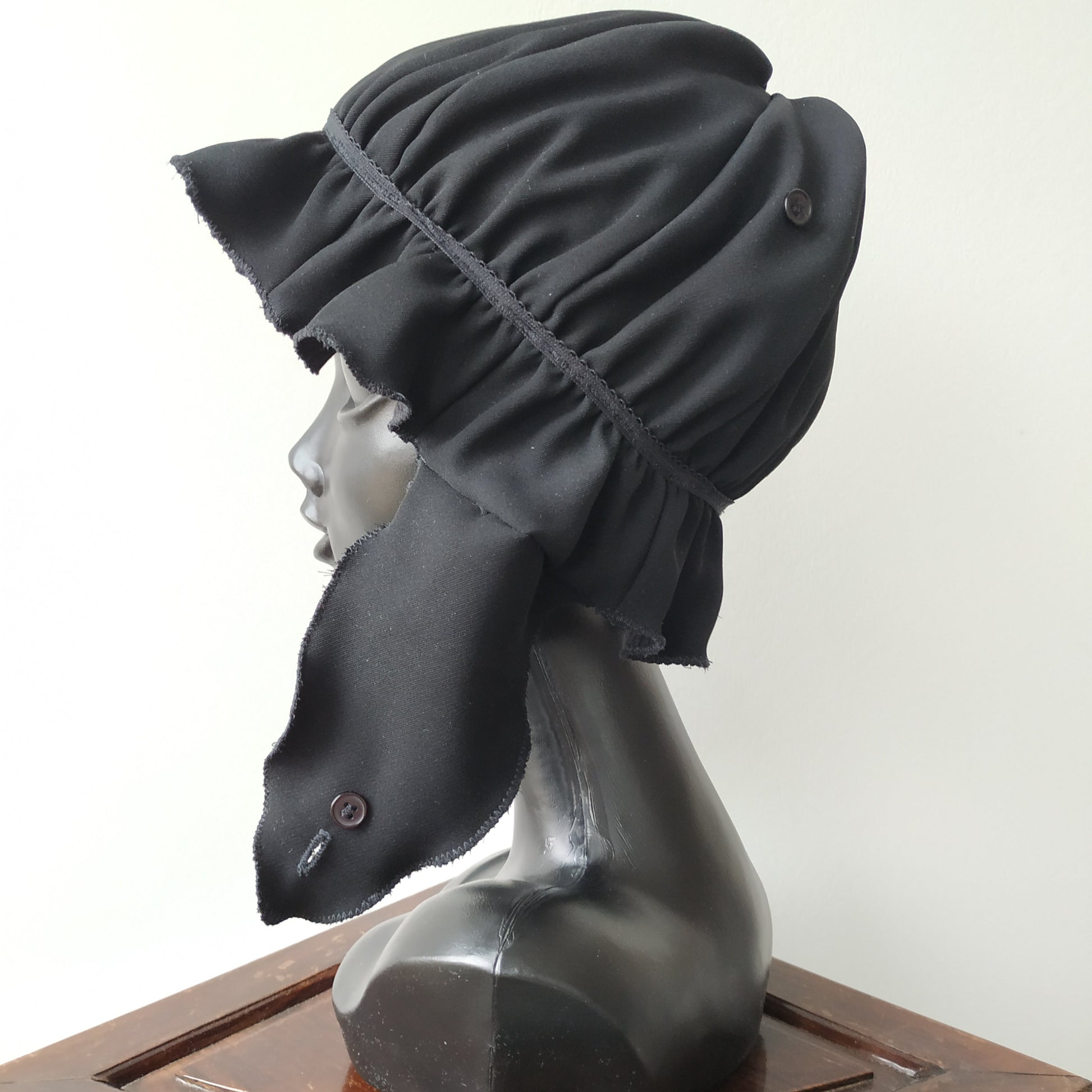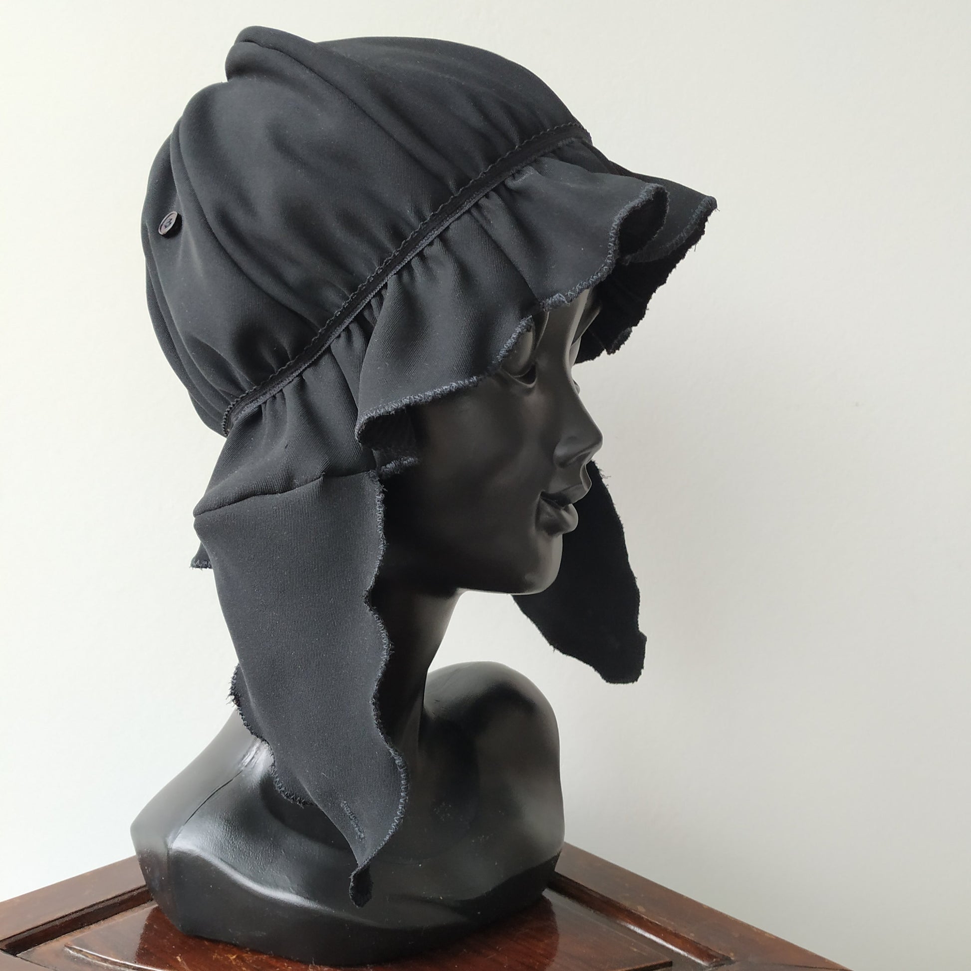 Handmade by @eithne_padraigin_ni_bhraonain from a beautiful and sporty nylon & elasthane fabric, a la Girbaud, Pr ada etc. Doubled with a ribbed cotton lining. Features ear flaps that can be buttoned together under the chin, or buttoned up on the head, or just let dangle.