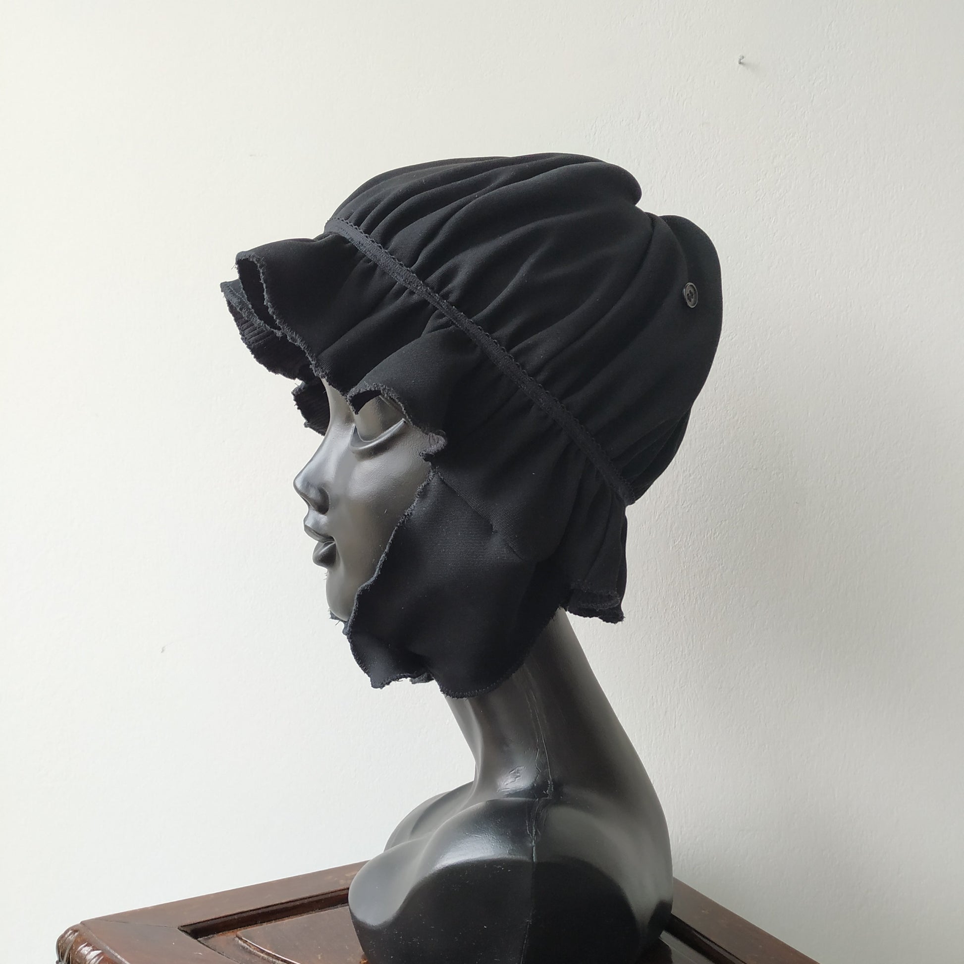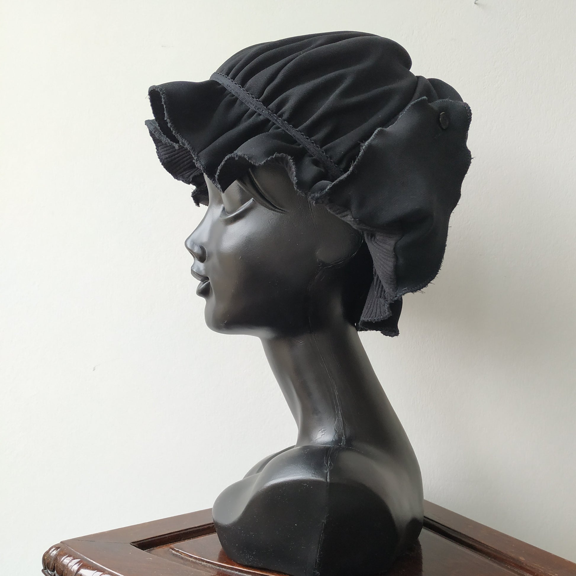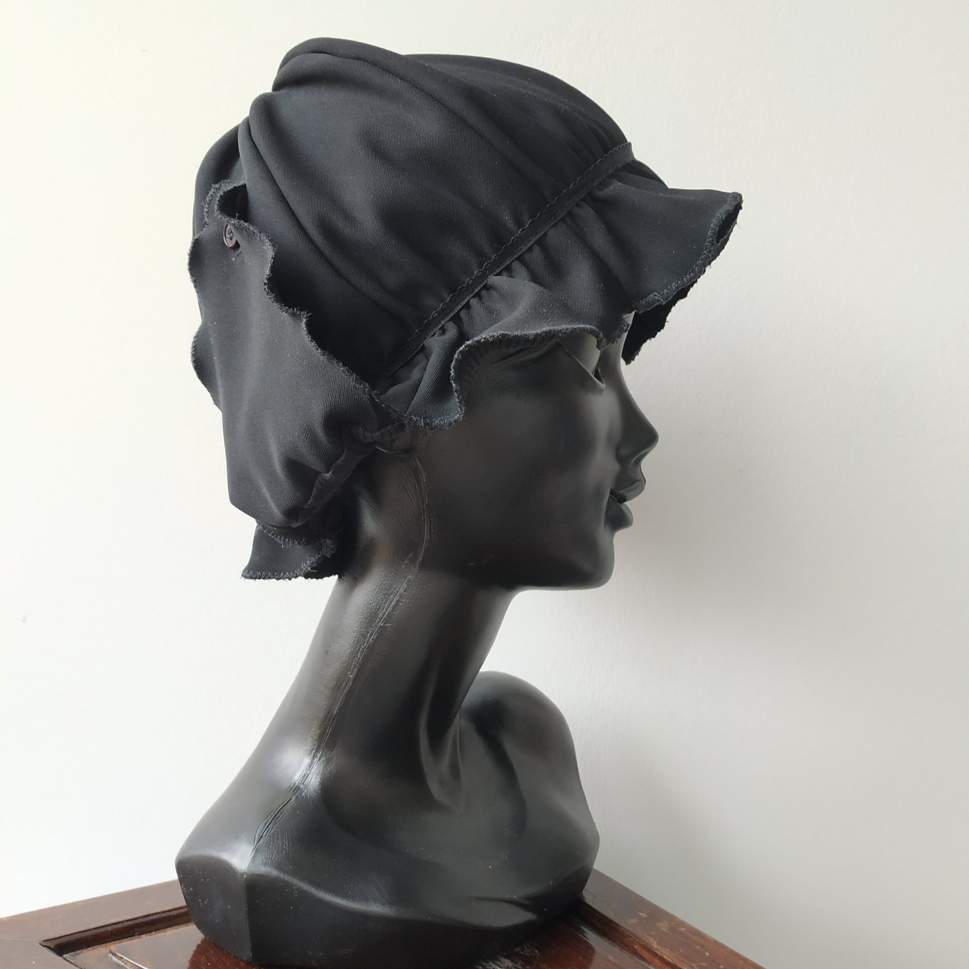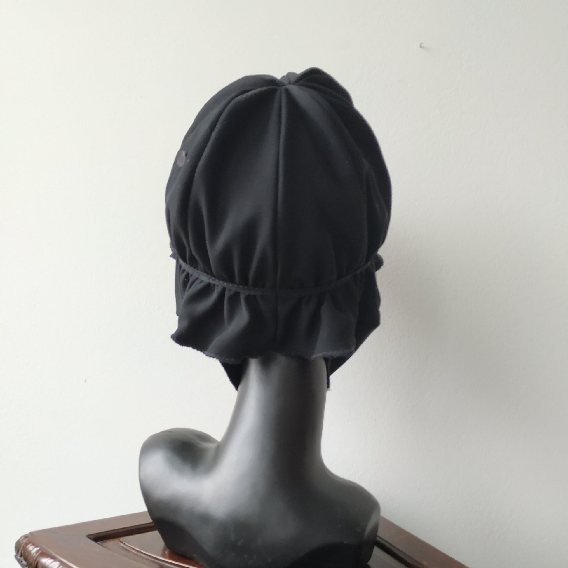 Handmade by @eithne_padraigin_ni_bhraonain from a beautiful and sporty nylon & elasthane fabric, a la Girbaud, Pr ada etc. Doubled with a ribbed cotton lining. Features ear flaps that can be buttoned together under the chin, or buttoned up on the head, or just let dangle.
