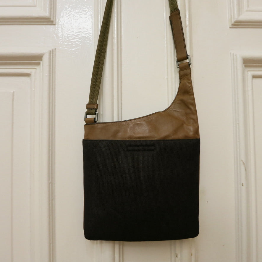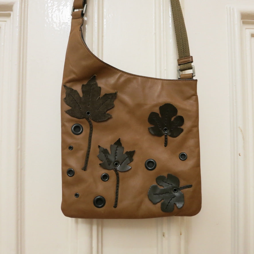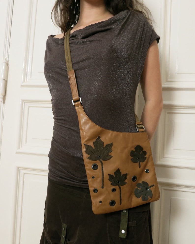 Prada f/w 1999 bag with leaf shaped appliques. In leather, suede and mesh fabric.