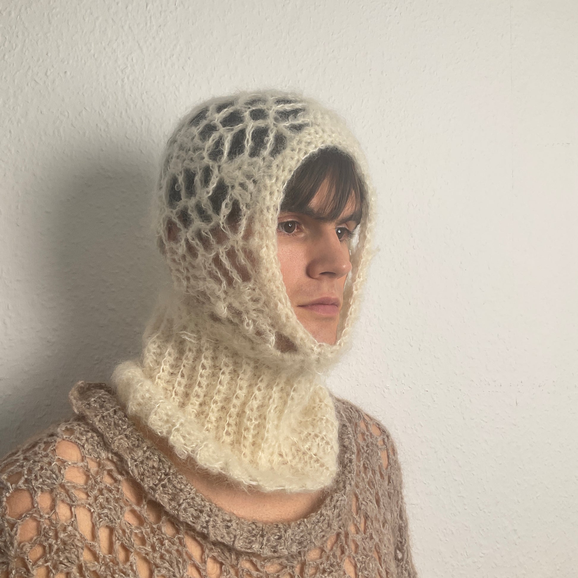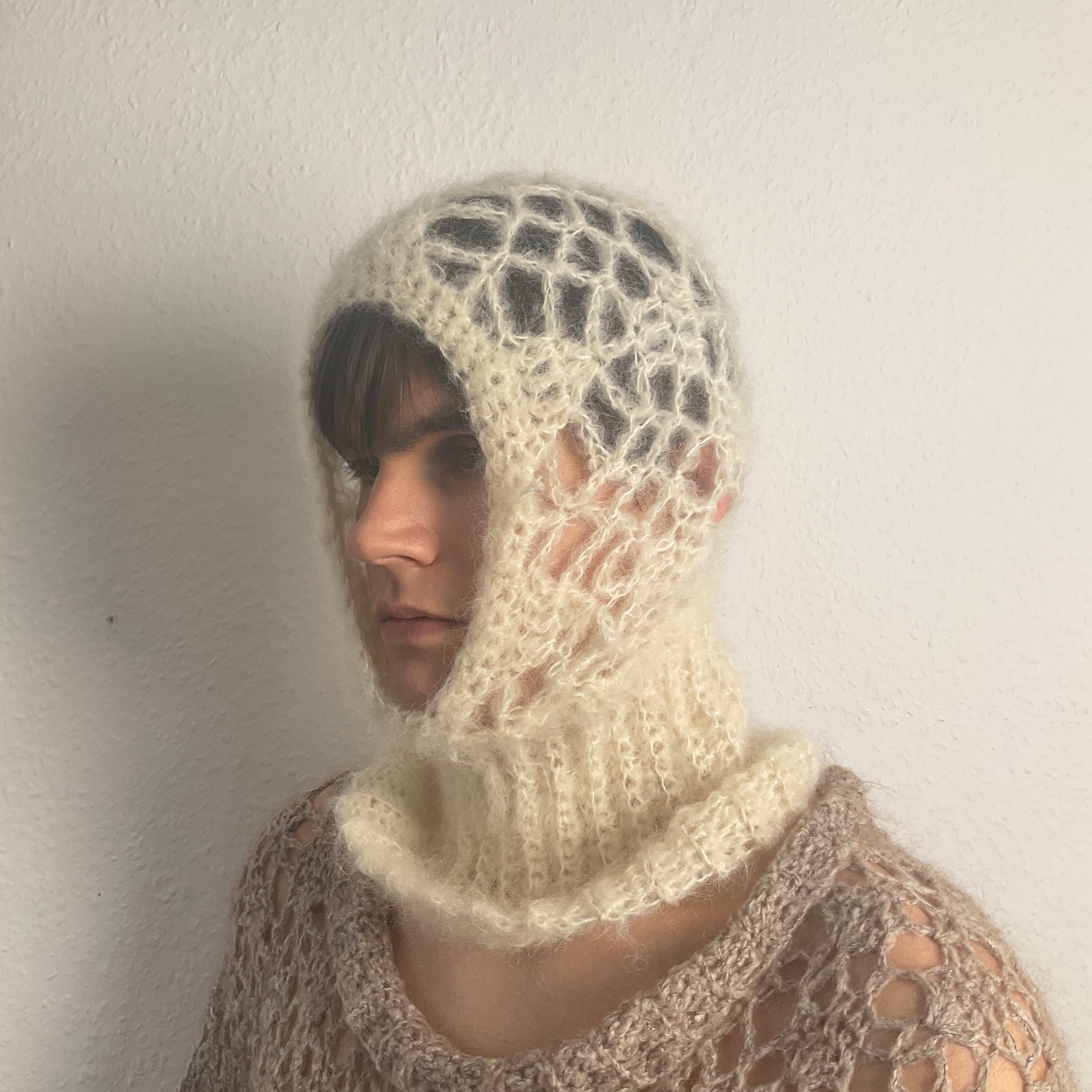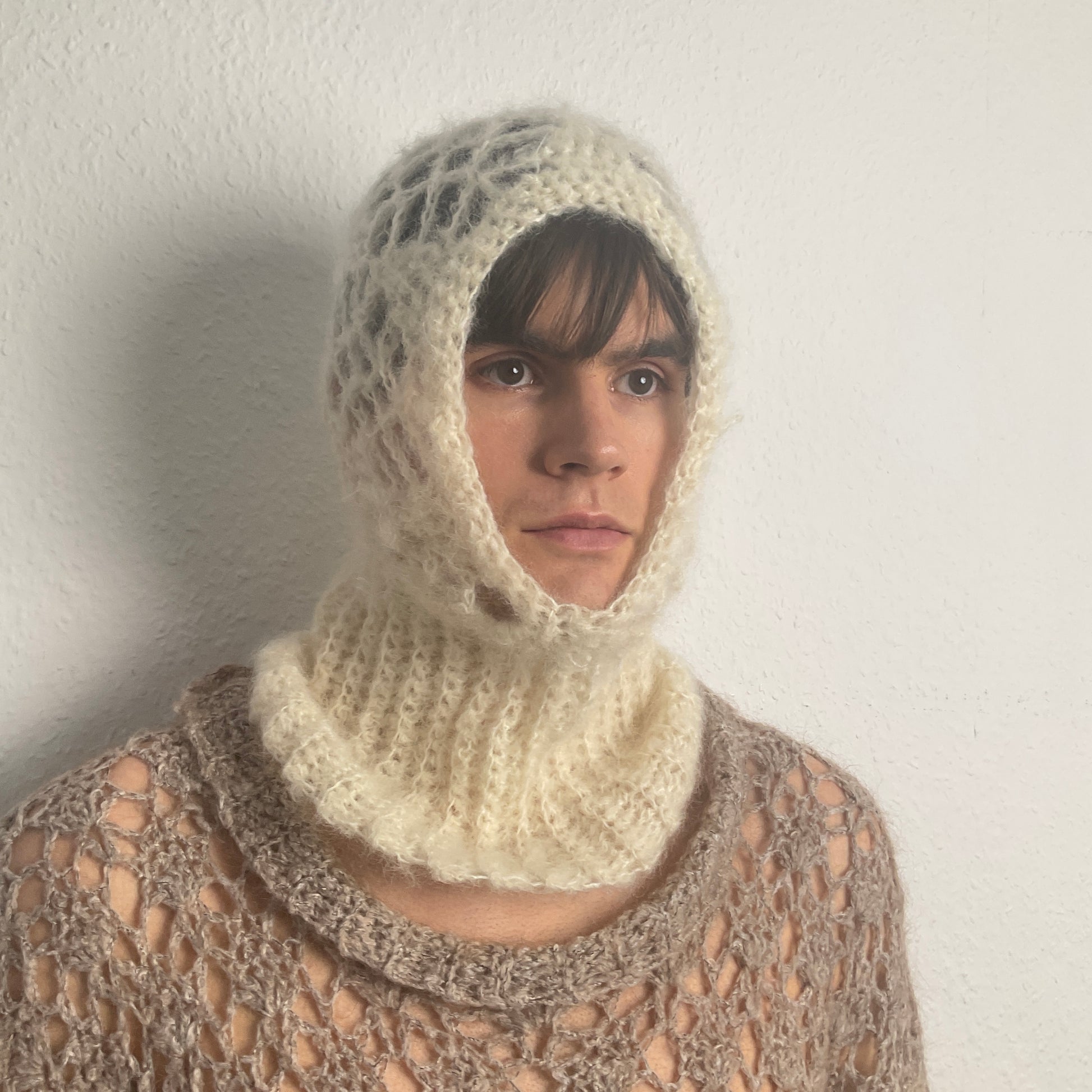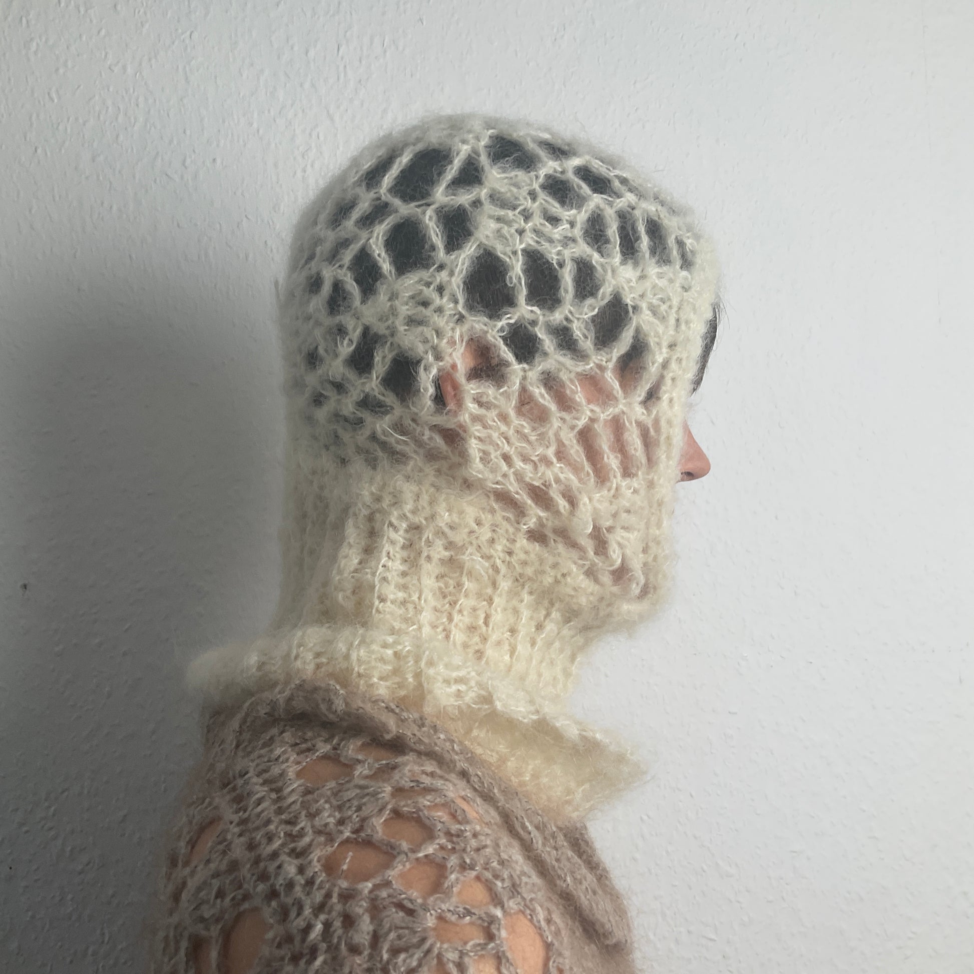 White crochet balaclava prototype. Handmade in Berlin by mođđe studio.