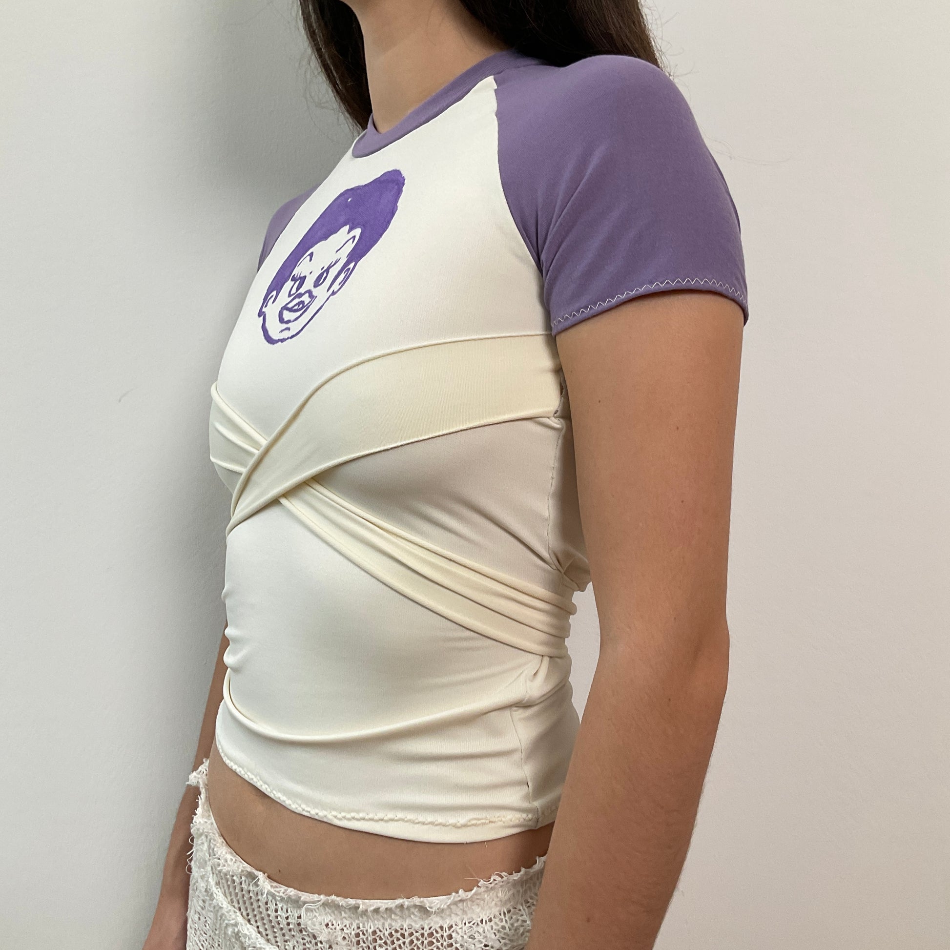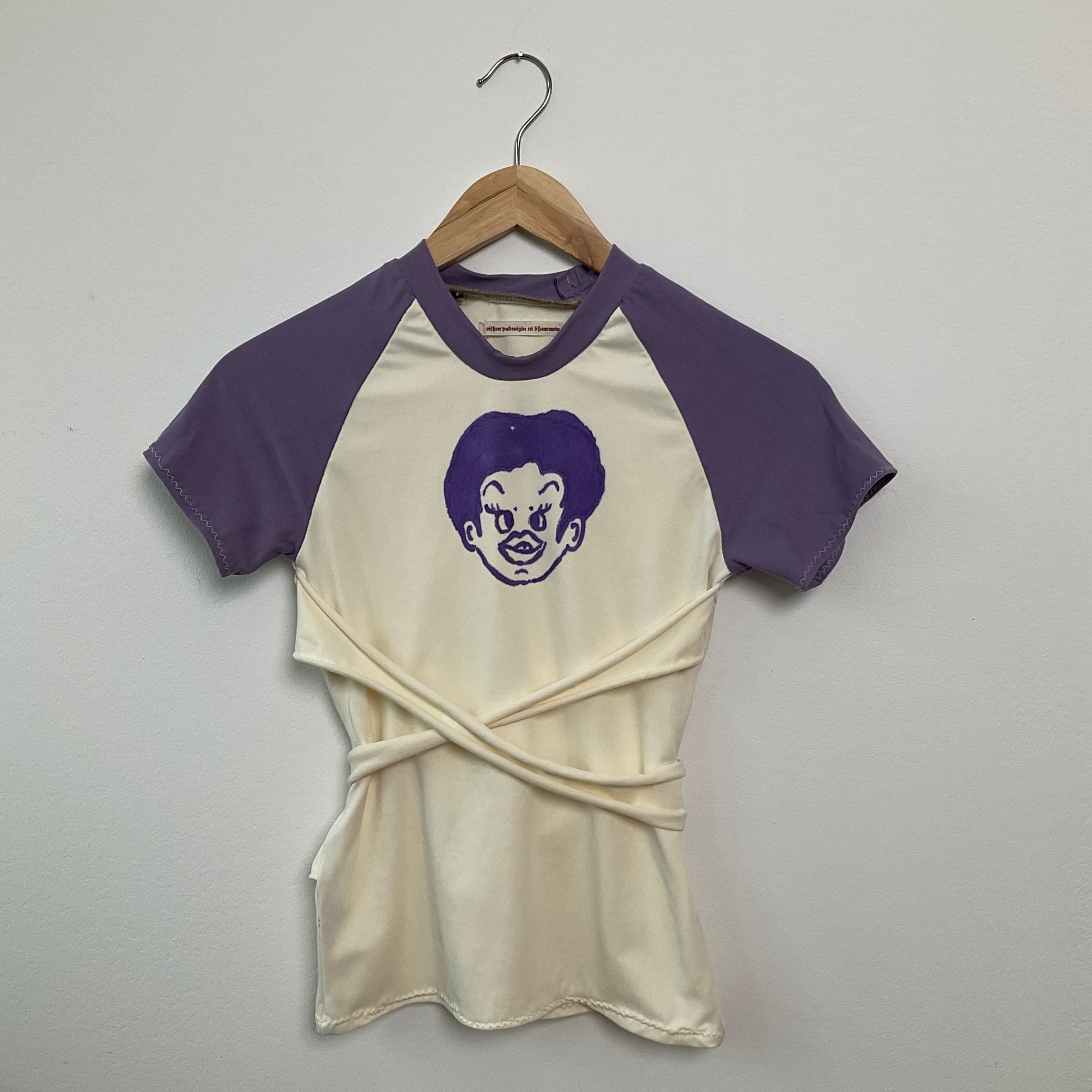 Raglan sleeve t-shirt with bondage straps and hand drawn print. Spandex body with cotton sleeves. Size S.