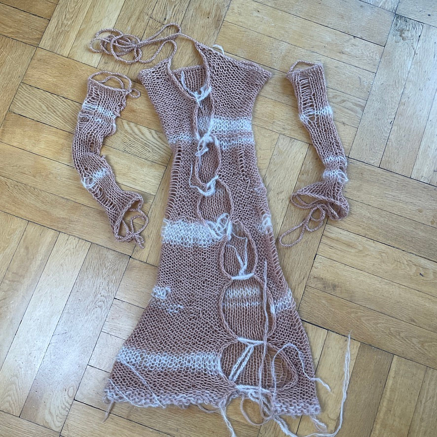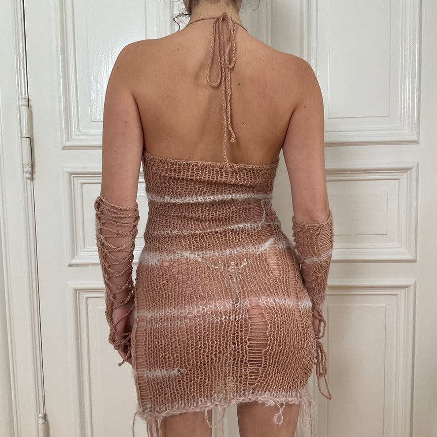Knit dress and sleeves set made from sheep's wool - plant dyed using chestnut shells - and stripes of mohair.