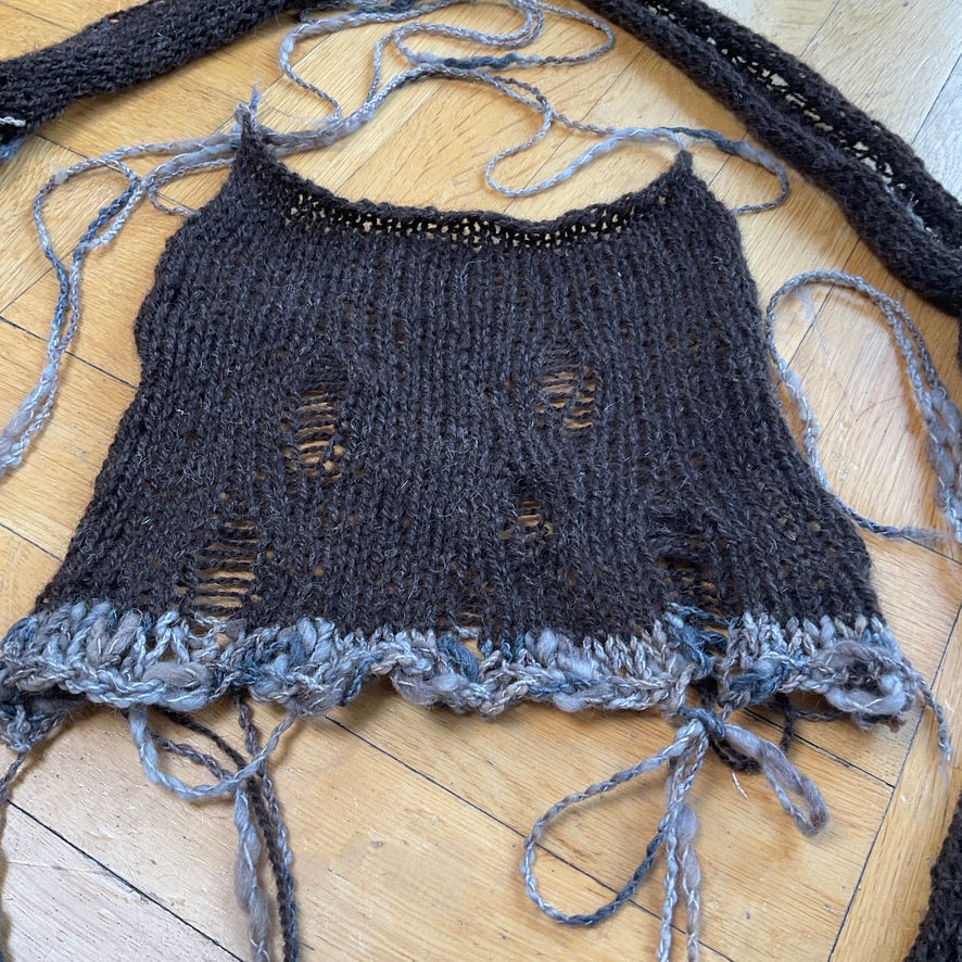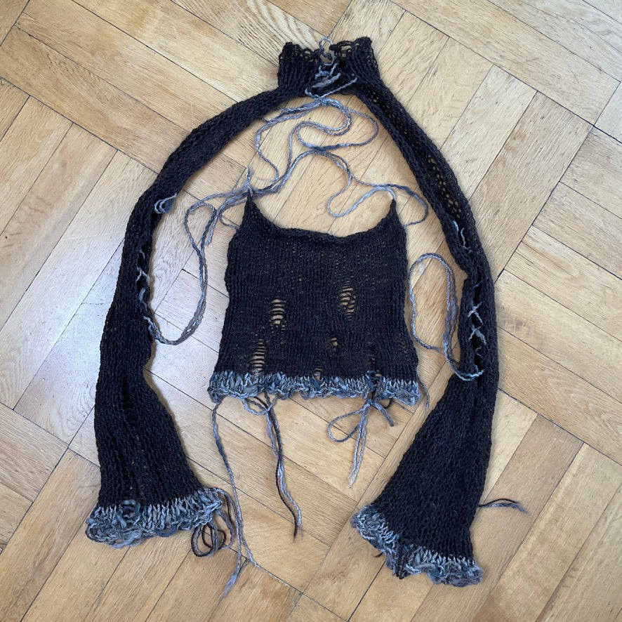 Knit top and shrug with lace up collar set. Made from Danish sheep's wool. The edges are made from a wool mix.