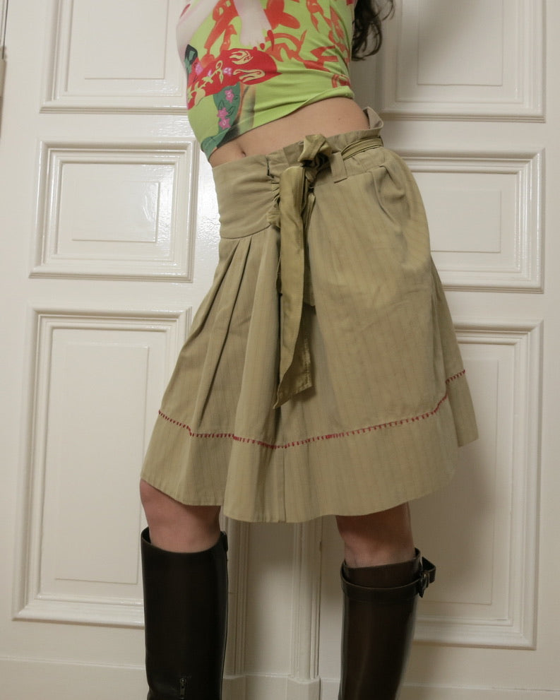 Beige pinstripe midiskirt from Sportmax with satin ribbon belt.