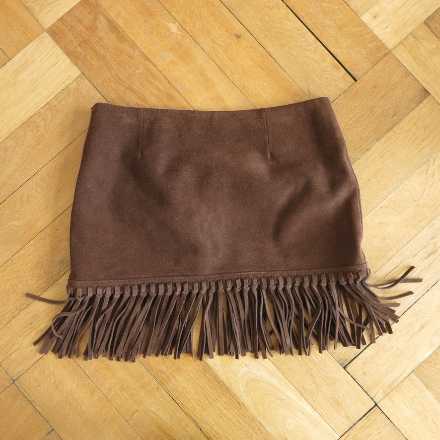 Dark brown suede miniskirt with fringe.