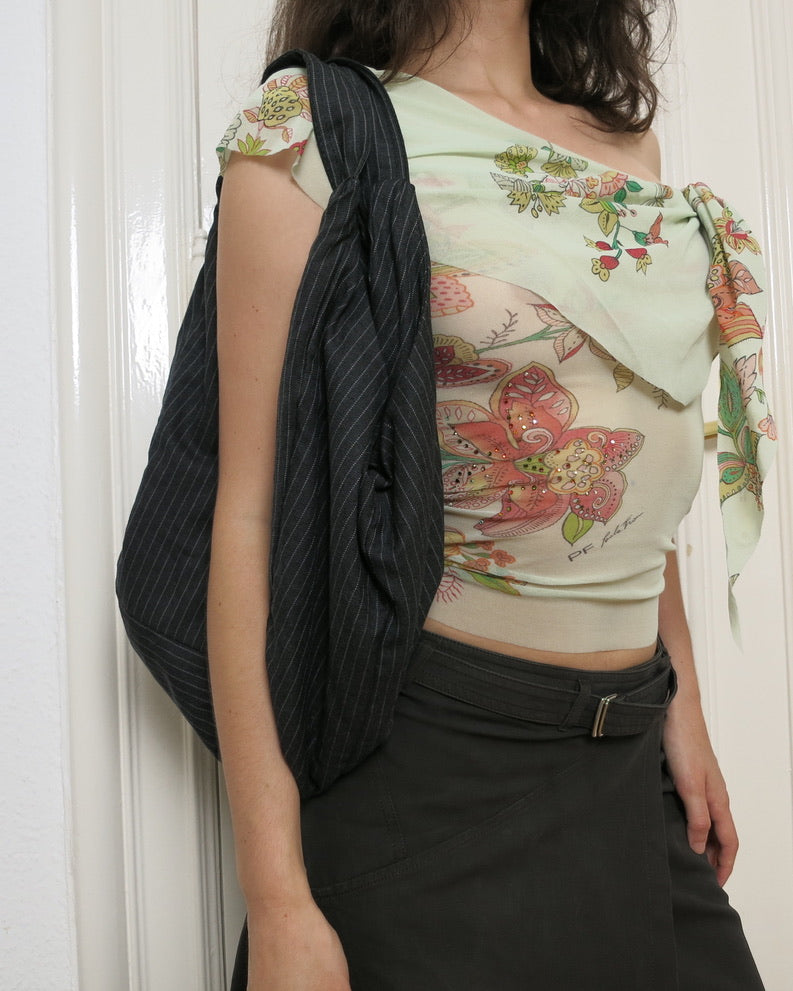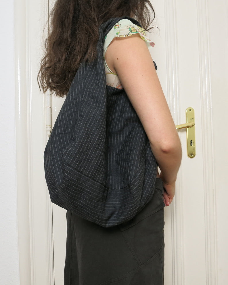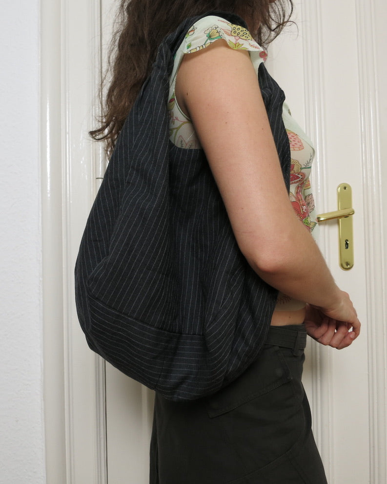 Spacious tote in pinstriped wool from tricot Comme des Garcons. Has two big inner chambers and two smaller zippered pockets.