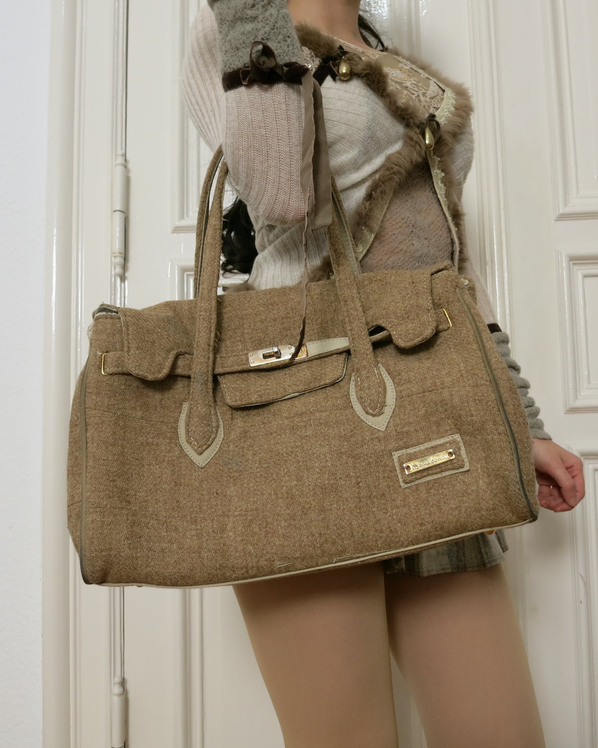 Beige Birkin-style purse in a sturdy wool fabric, with a knit lining.