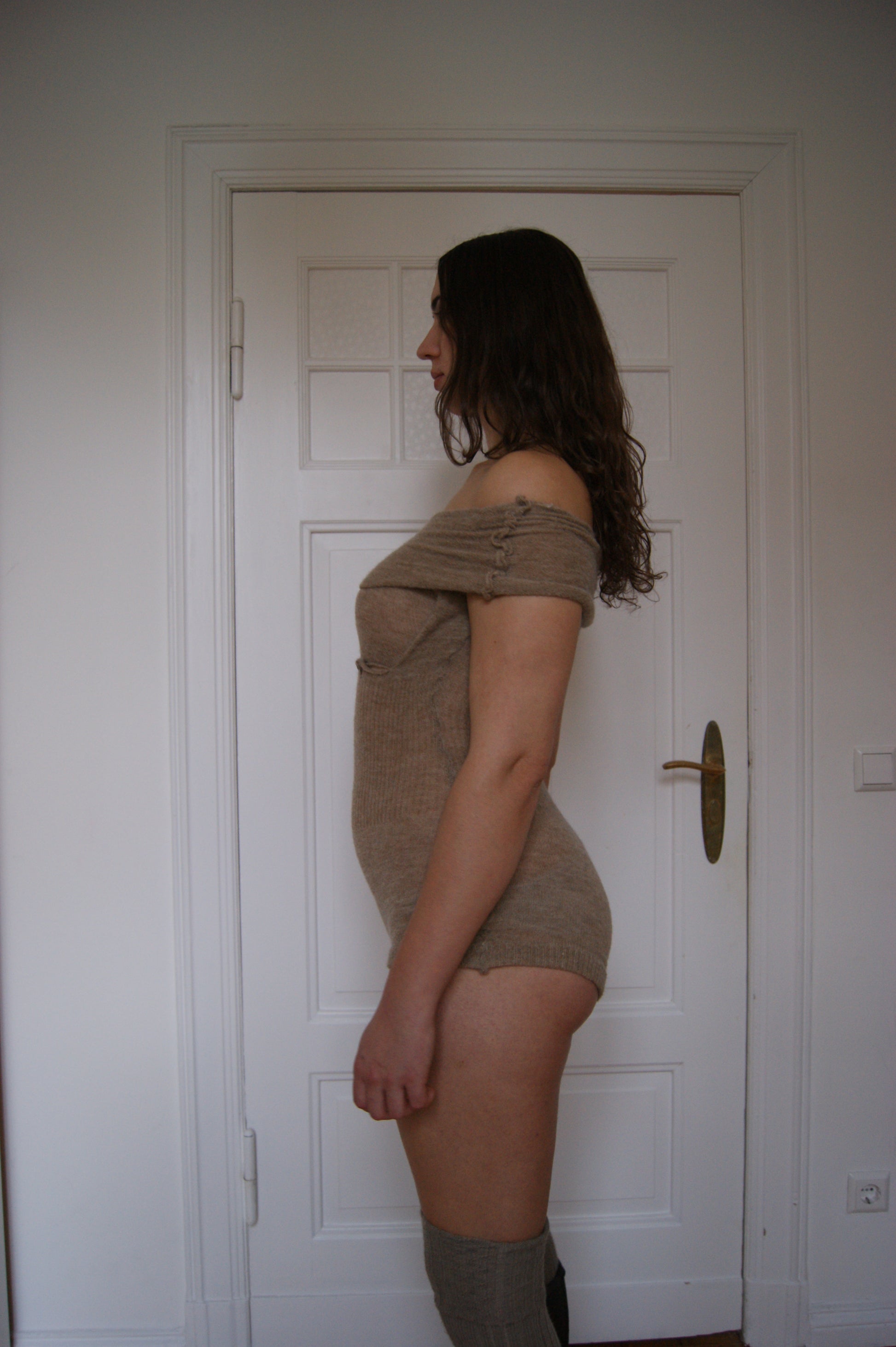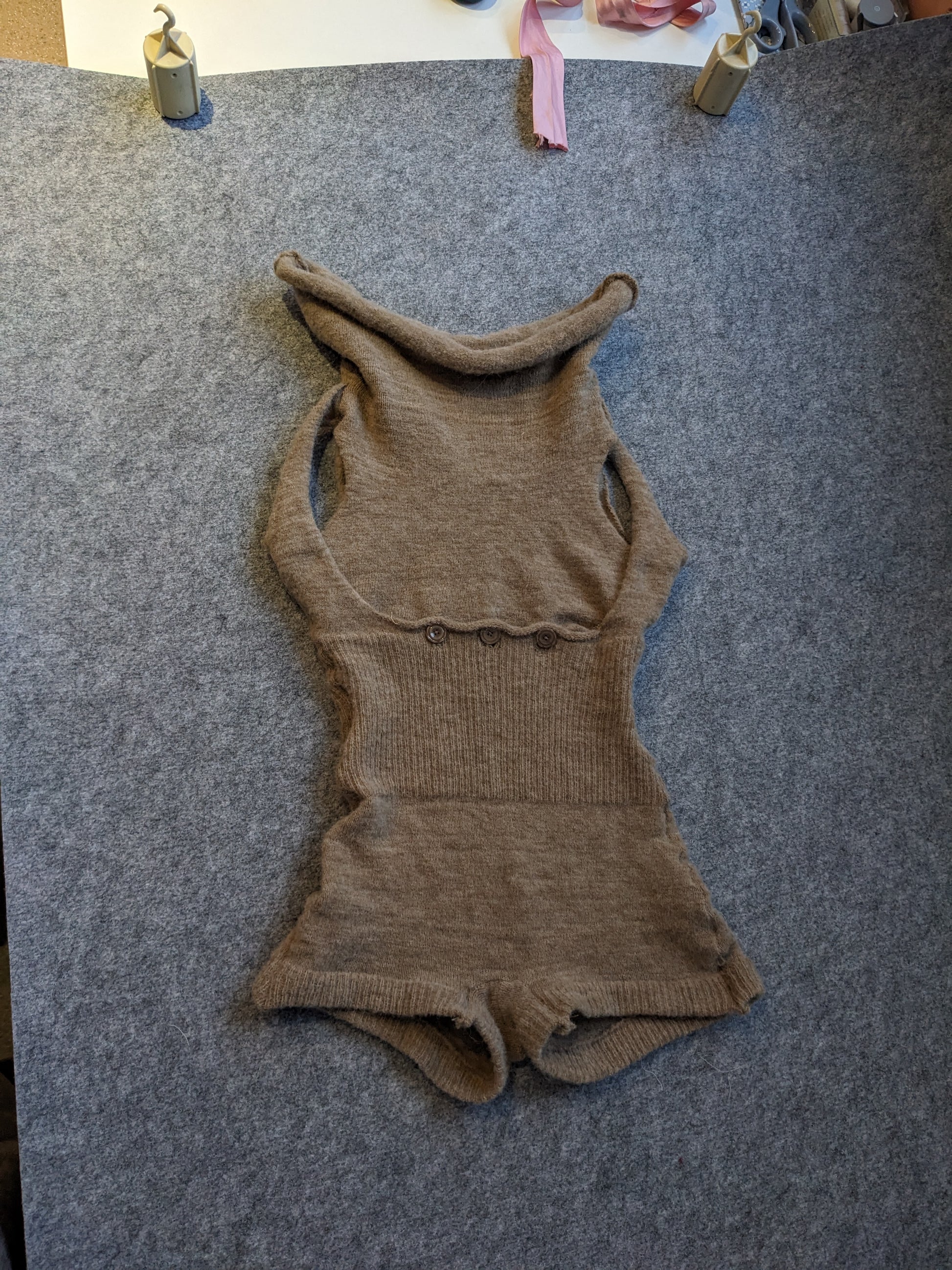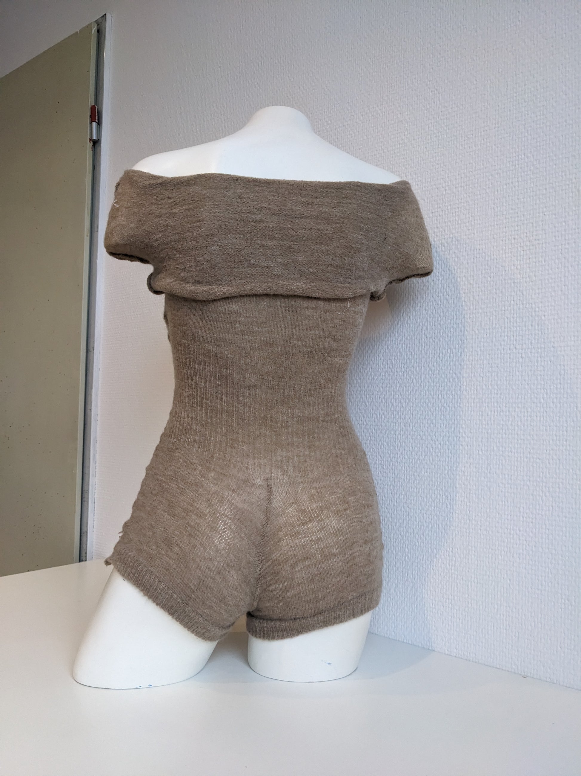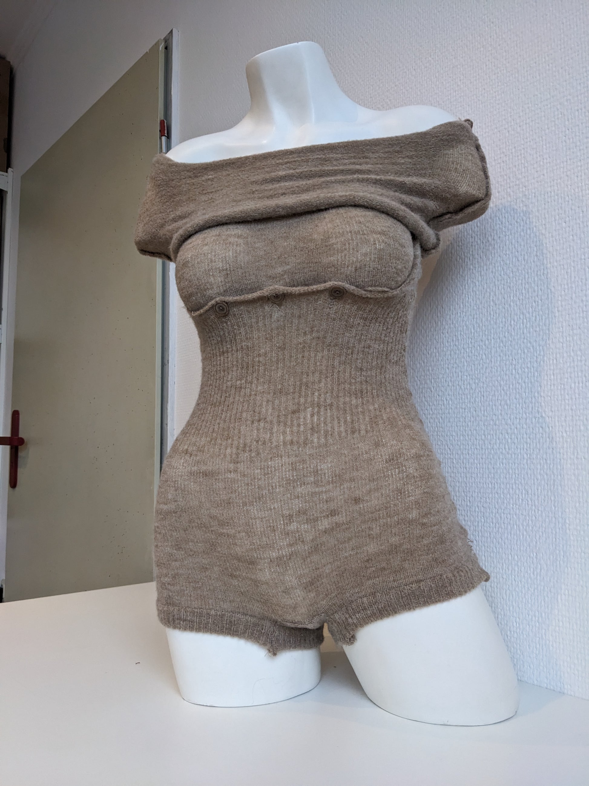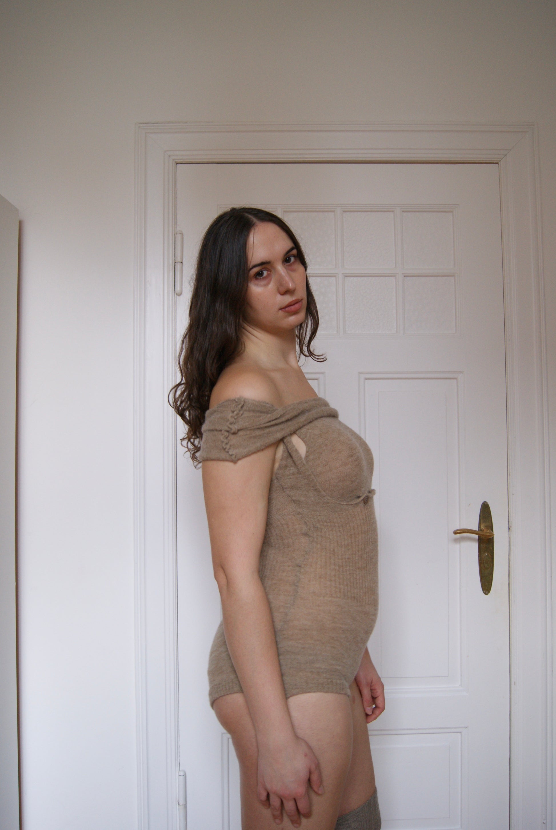 Bodysuit knit in luxuriously soft alpaca yarn, supplemented with a strand of hair thin spandex fiber for stretch and fit. Made from vintage Italian yarn.
