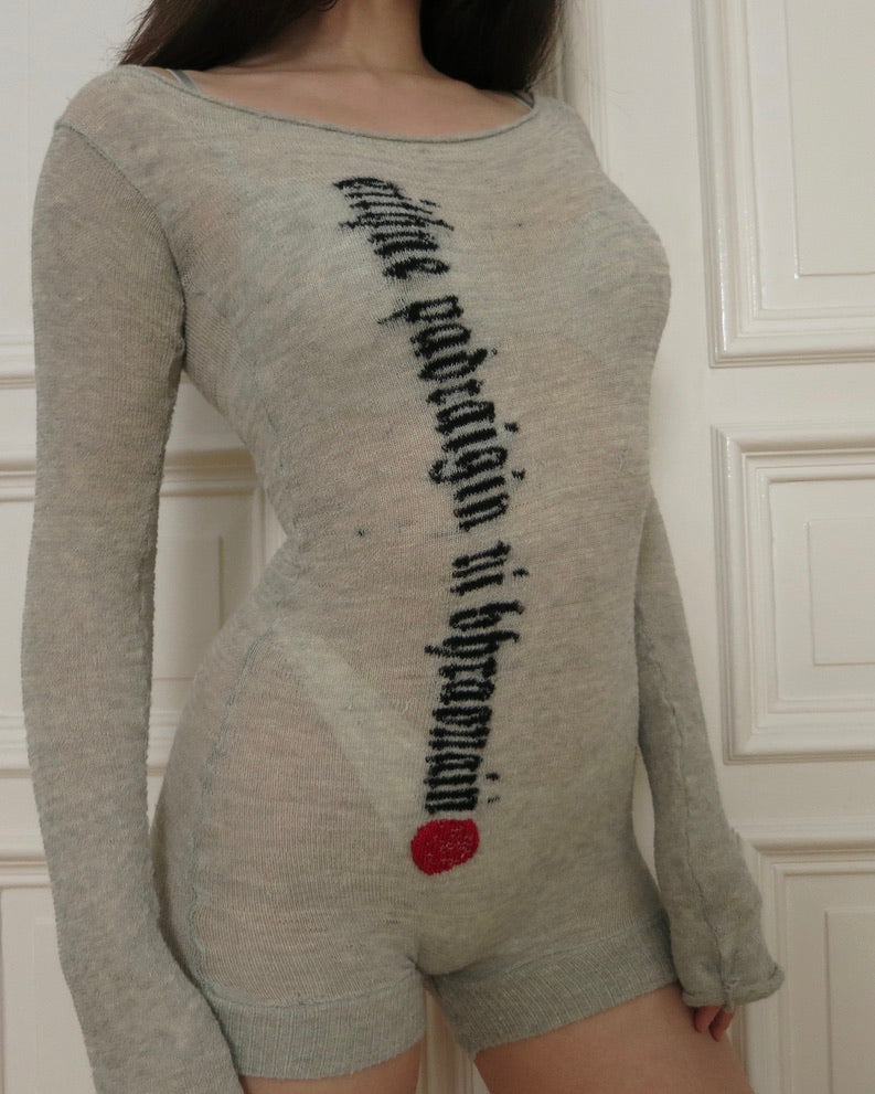 Onesie in extra fine cotton and spandex yarn with bouclé effect. Very light and very stretchy so it can fit mulitple sizes and heights.