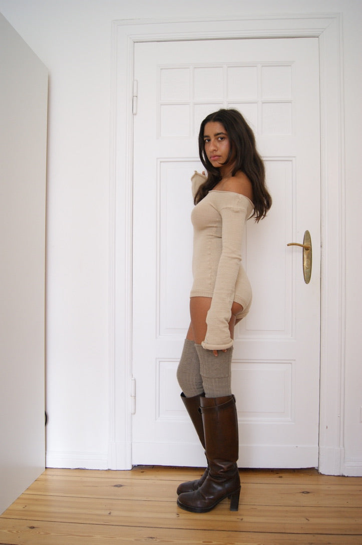 Bodysuit knit in merino yarn with mohair jacquard, supplemented with one strand hair thin spandex fiber for stretch and fit. Made from second hand yarn.