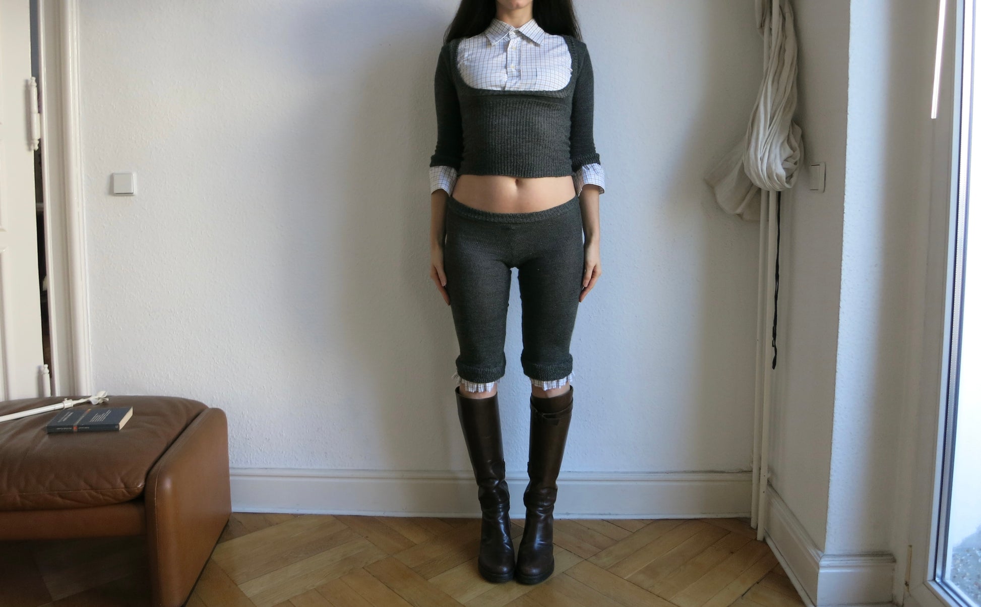 Knit capri shorts and three quarter sleeve top set in soft grey alpaca wool. Collar and details from an upcycled cotton shirt.
